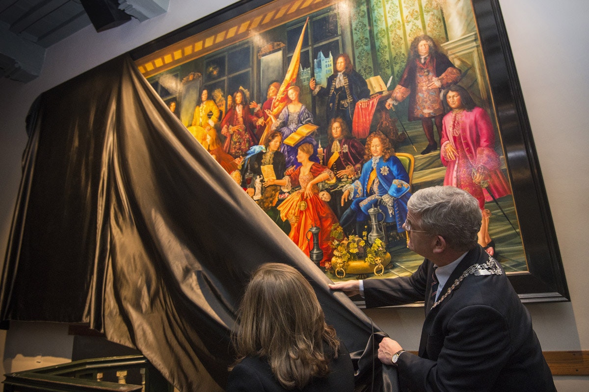 15-01-2015: Van Zanen onthult het schilderij Vrede van Utrecht 1713-2013 in Stadskasteel Oudaen.