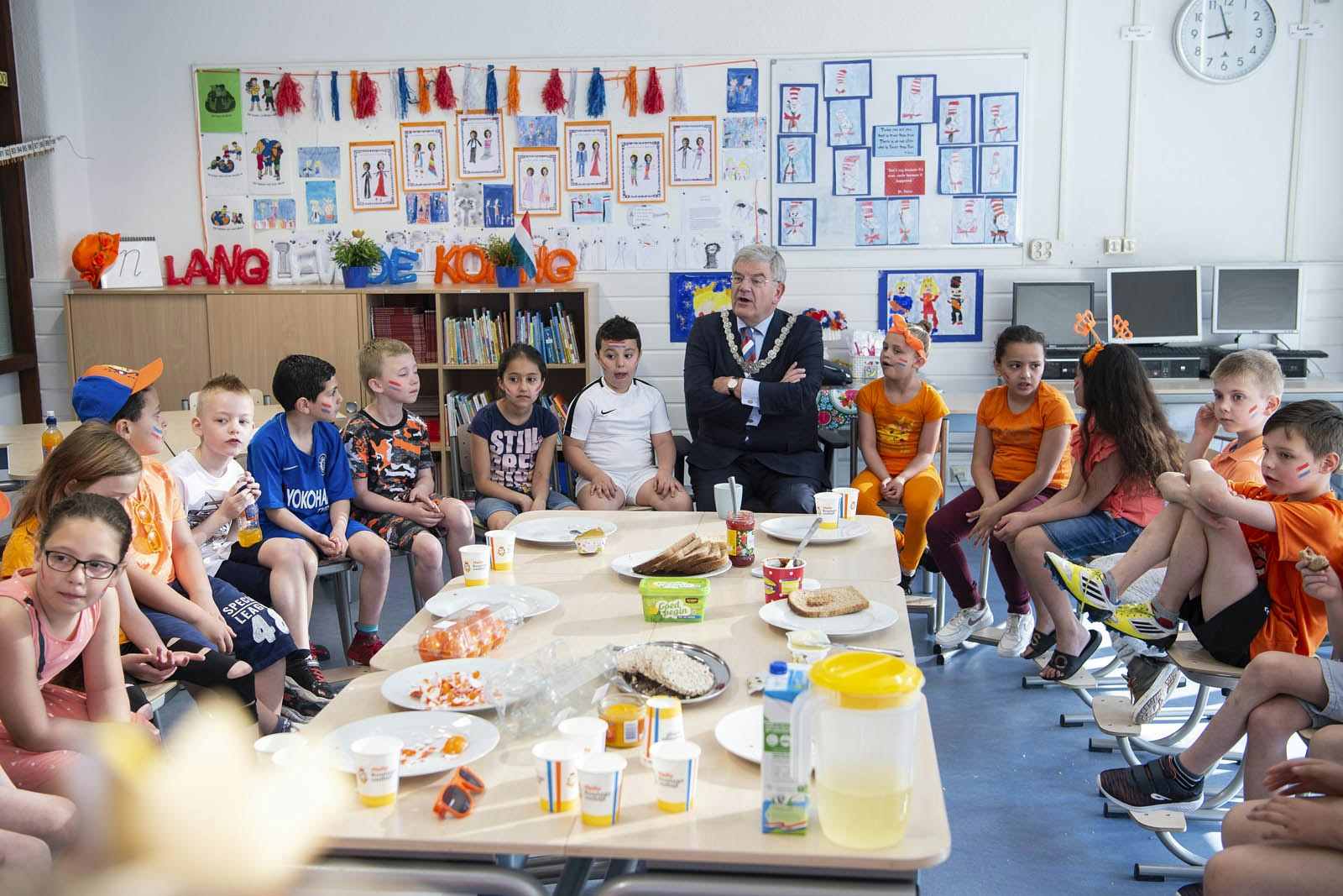 20-04-2018: Van Zanen opent de Koningsspelen bij een basisschool in Ondiep.