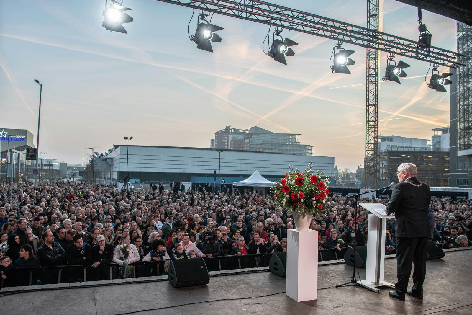 22-03-2019: Van Zanen spreekt het publiek toe voor de stille tocht ter nagedachtenis aan de tramaanslag.