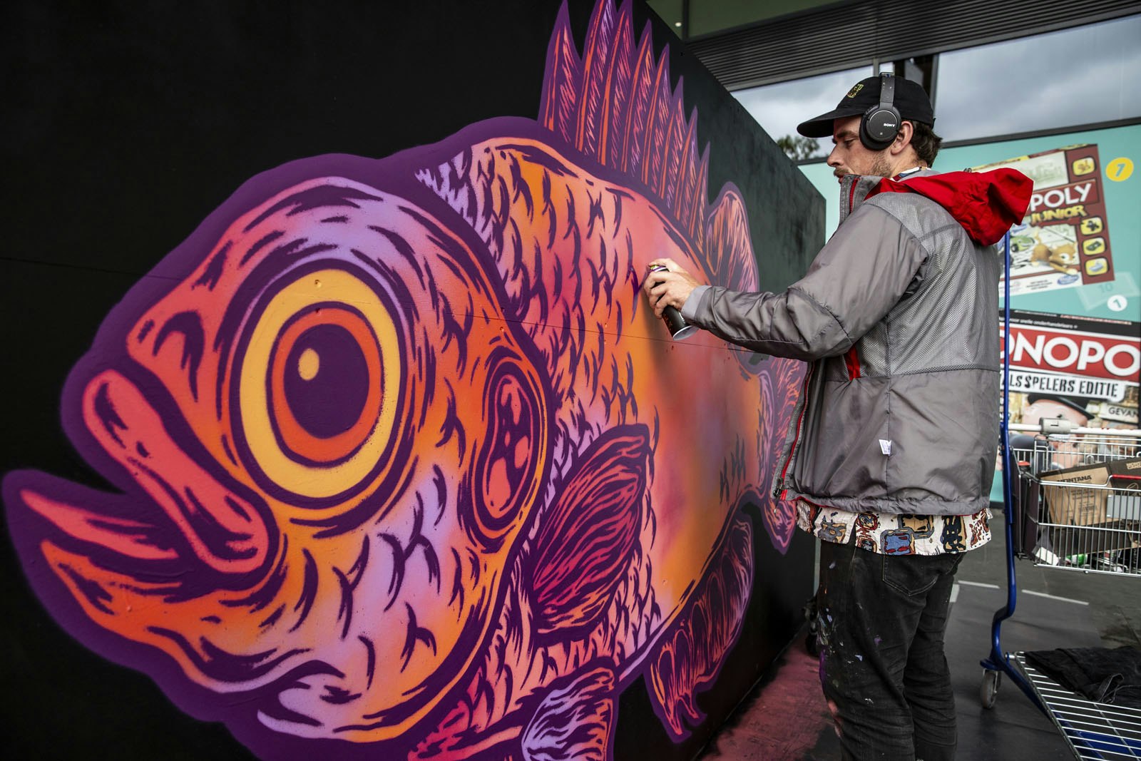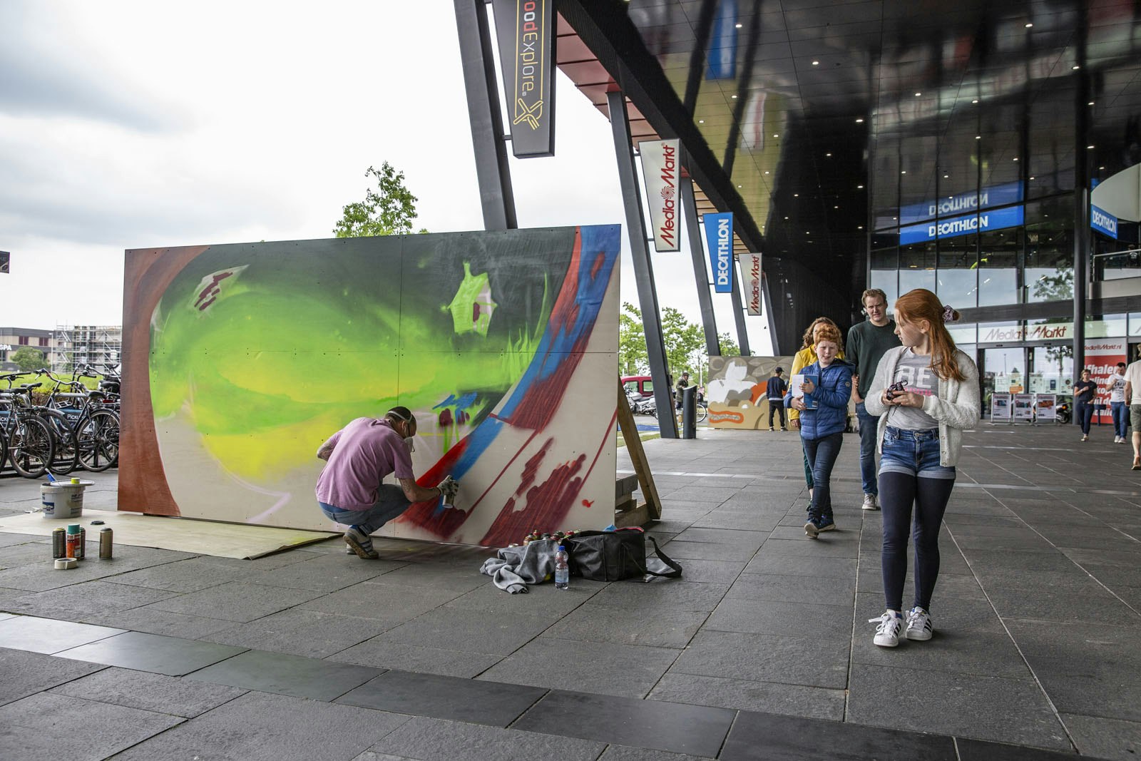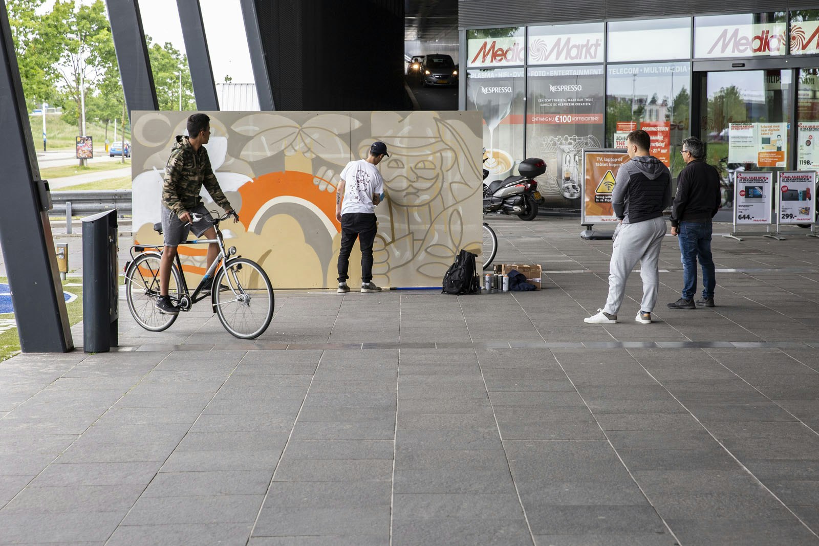 Tien graffitikunstenaars waren dit hele weekend bij The Wall in Leidsche Rijn om op verschillende houten panelen kunstwerken te maken. De werken moeten het grijze gebied van het winkelcentrum tijdelijk meer kleur geven.