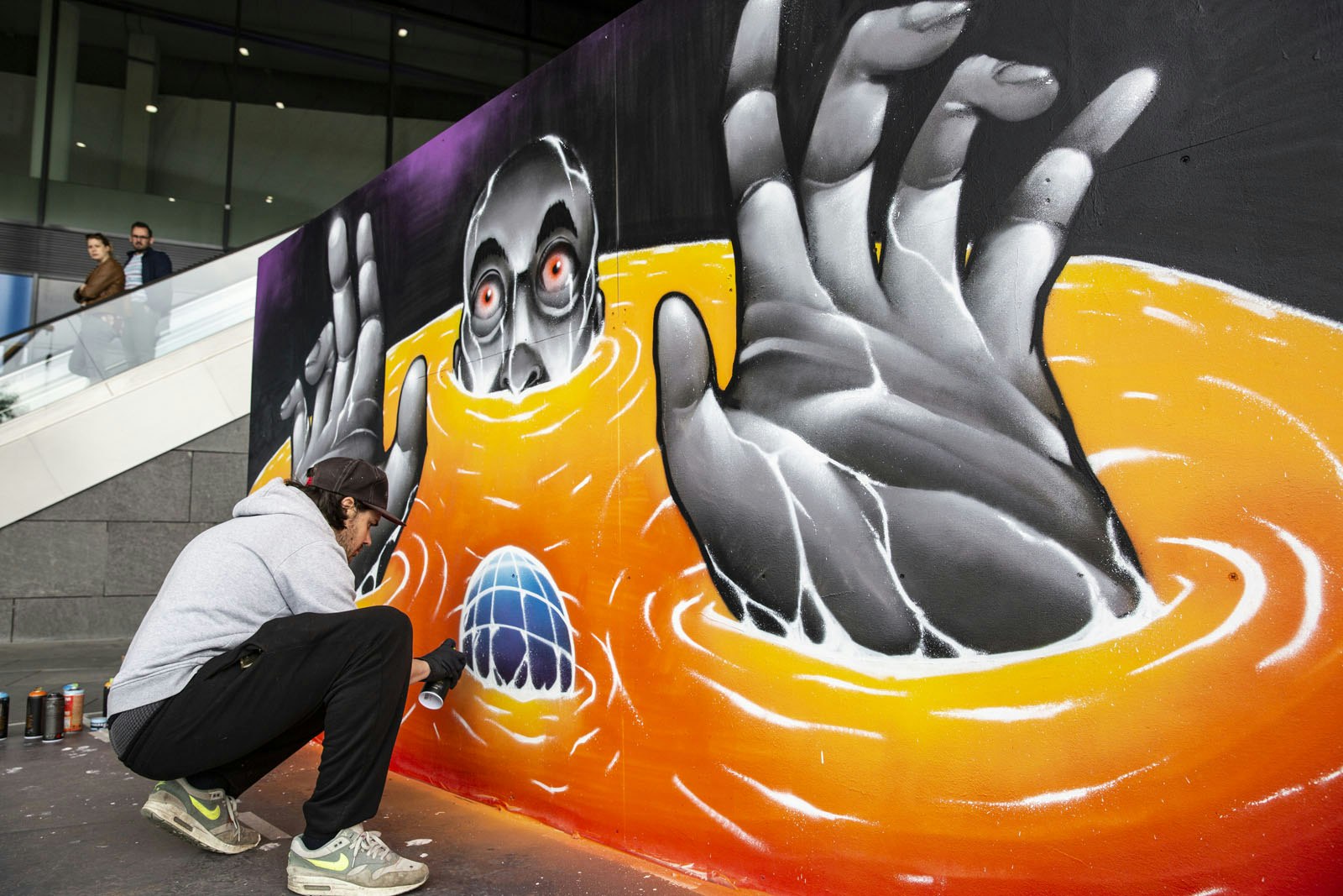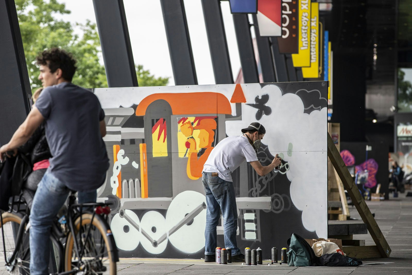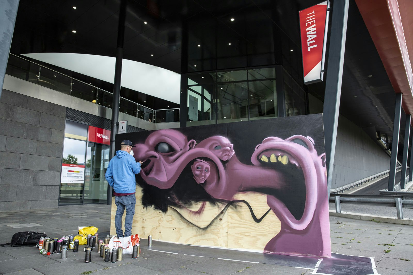 Tien graffitikunstenaars waren dit hele weekend bij The Wall in Leidsche Rijn om op verschillende houten panelen kunstwerken te maken. De werken moeten het grijze gebied van het winkelcentrum tijdelijk meer kleur geven.