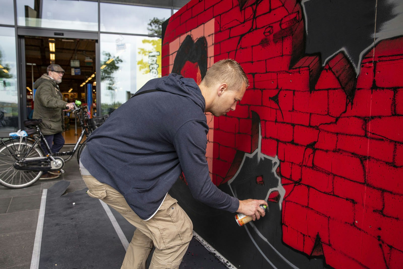 Dit is de meest burgerlijke en truttige versie van grafitti. Op houten panelen voor een noodlijdend winkelcentrum. Het geeft toch een beetje dat ‘urban gevoel’, terwijl het niet te wild mag worden.