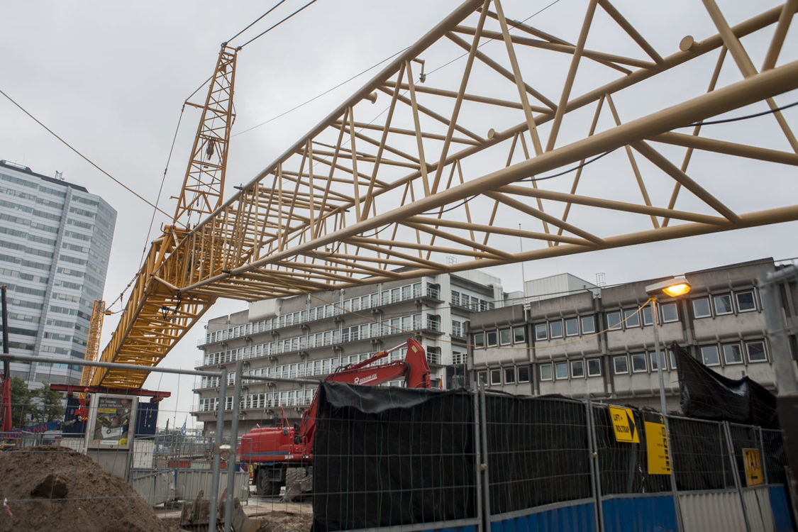 Er waren 28 vrachtwagens voor nodig, maar het is gelukt. De 144 meter hoge bouwkraan, die na het weekend in gebruik genomen gaat worden, ligt in stukken naast Utrecht Centraal.
