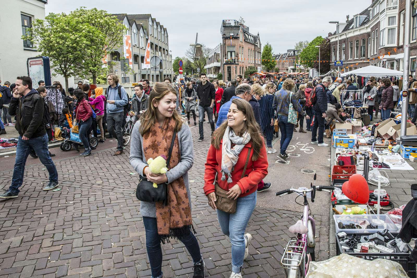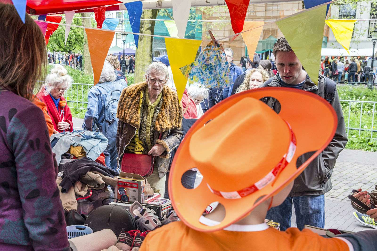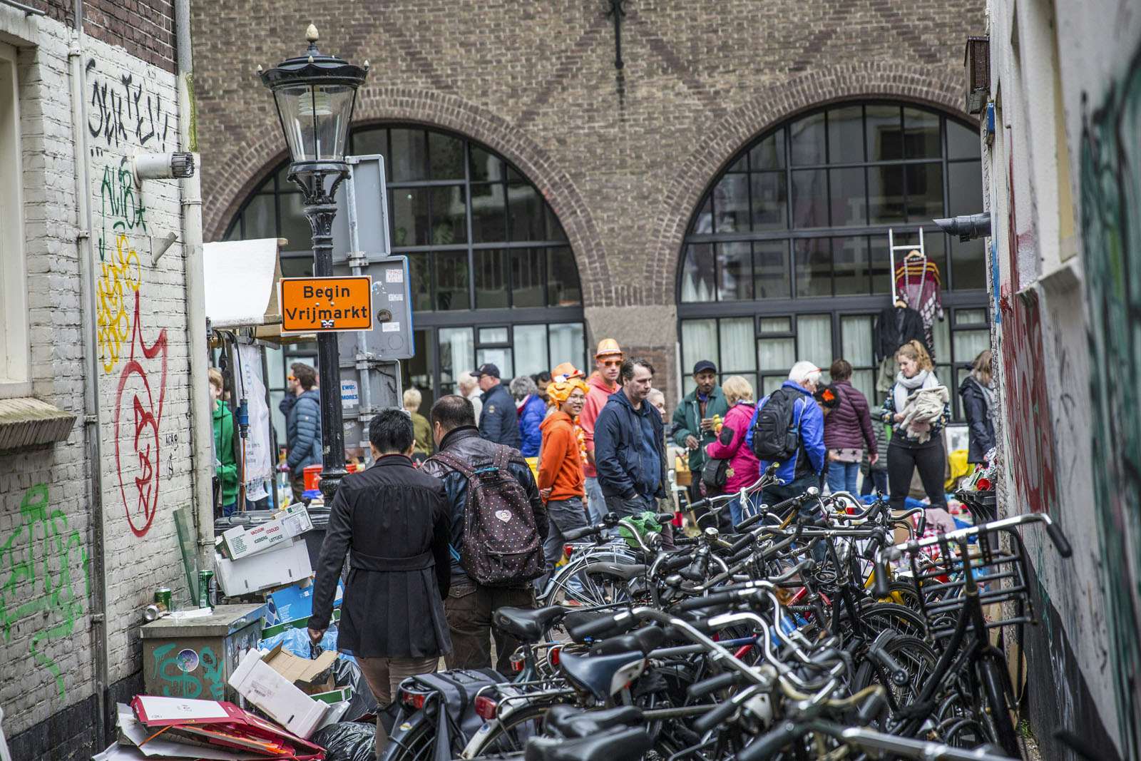 Bezoekers struinen langs de vrijmarkt op zoek naar koopjes of dansen op één van de vele openluchtfeesten. Net zoals gisteravond lijkt Koningsdag in Utrecht zonder grote incidenten te verlopen.