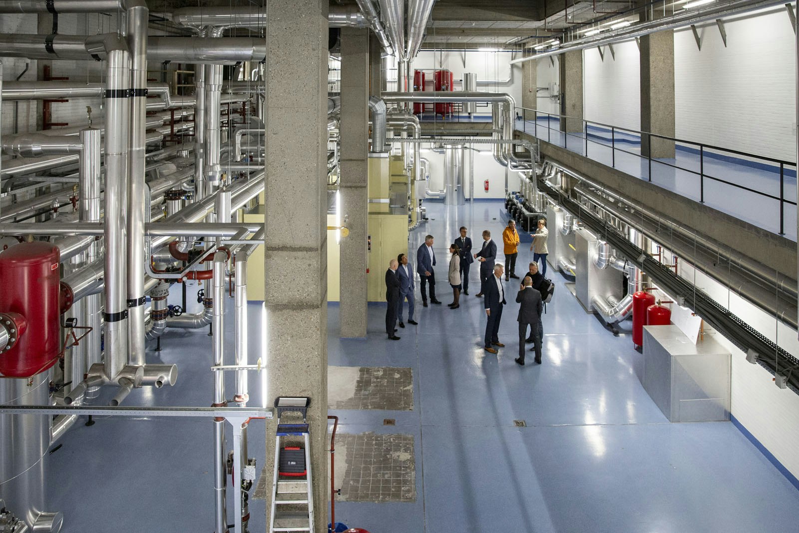 Midden in het kantoor, naast één van de vele werkvloeren, is een grote ruimte waar gigantische warmtepompen staan. Deze pompen zorgen ervoor dat het 84.000 m2 tellende kantoorpand CO-2 neutraal is. In dezelfde ruimte stonden voorheen de gasinstallaties waar ooit 14 miljoen kubieke meter gas doorheen ging.