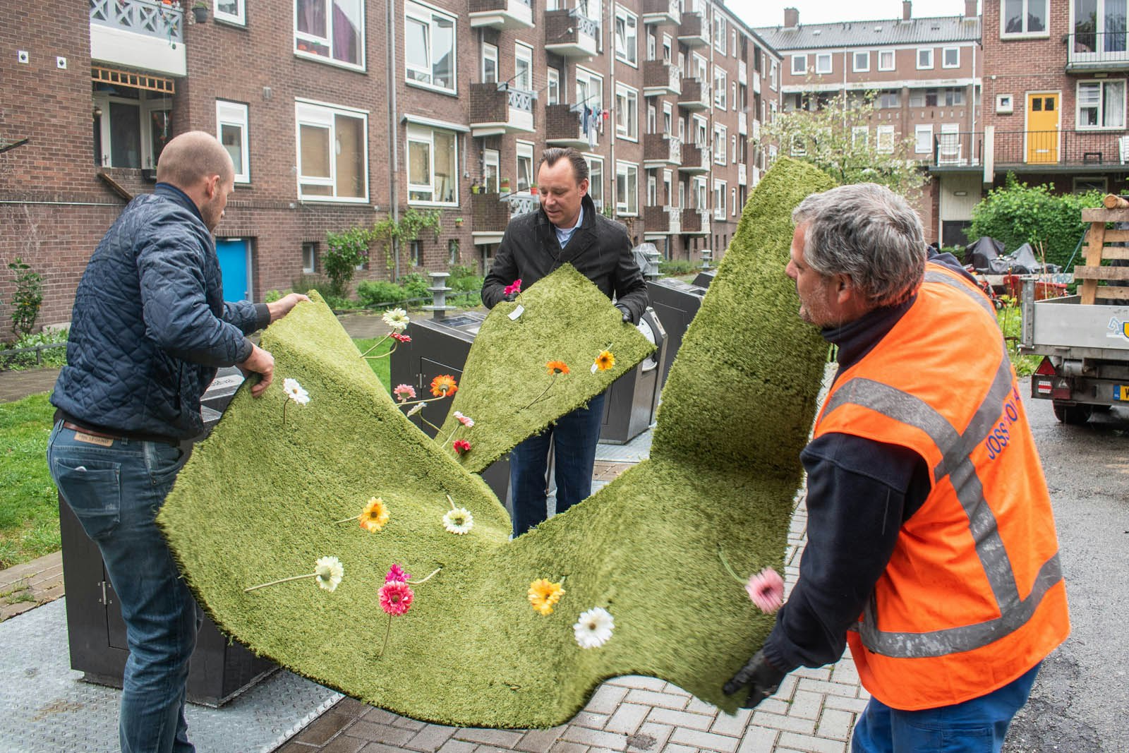 Op zes locaties worden de komende tijd bij dertien verschillende ondergrondse containers kunstgrasveldjes met bloemen geplaatst. Verschuure: “Met deze fleurige kunstgrasveldjes willen we op een positieve manier proberen om zwerfafval rondom ondergrondse containers tegen te gaan We willen niet alleen bekeuren en rotzooi opruimen, maar ook kijken of we het gedrag van mensen kunnen veranderen.”