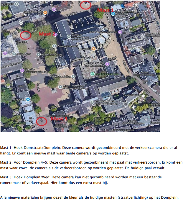 De gemeente Utrecht heeft in totaal 91 camera’s: 71 vaste camera’s en 20 tijdelijke die maximaal zes maanden op een locatie mogen staan. Dit aantal mag niet overschreden worden, en een woordvoerder van de gemeente Utrecht legt uit dat de drie vaste camera’s voor op het Domplein eerst op de Bernadottelaan, Amsterdamsestraatweg en Westplein stonden. “Op de oude posities voldeden ze niet meer aan de criteria of is sprake van herinrichting waardoor de camera op dit moment geen toegevoegde waarde heeft”, stelt hij. De camera’s van de gemeente worden elk jaar geëvalueerd.