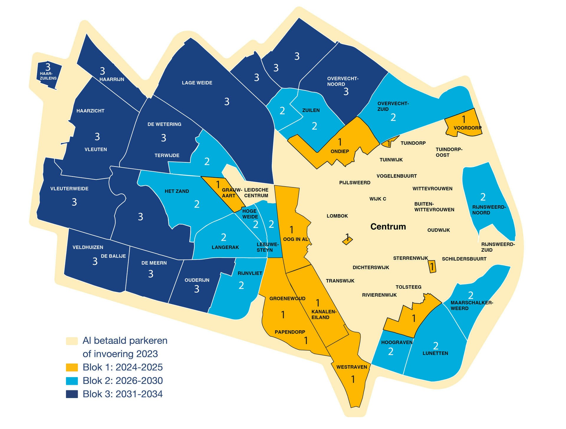 Dat dit voorstel mogelijk leidt tot uitstel van betaald parkeren in blok 2, heeft geen invloed op de invoering van betaald parkeren die vanaf november 2025 ingaat voor de buurten in blok 1. Het uitstel is namelijk voorgesteld om eventuele problemen op de lange termijn te voorkomen. Om deze invoering zorgvuldig te laten verlopen, gaat gemeente Utrecht extra inzetten op ondersteuning. Zo krijgen bewoners en ondernemers van blok 1 onder meer voorlichting en begeleiding aangeboden.