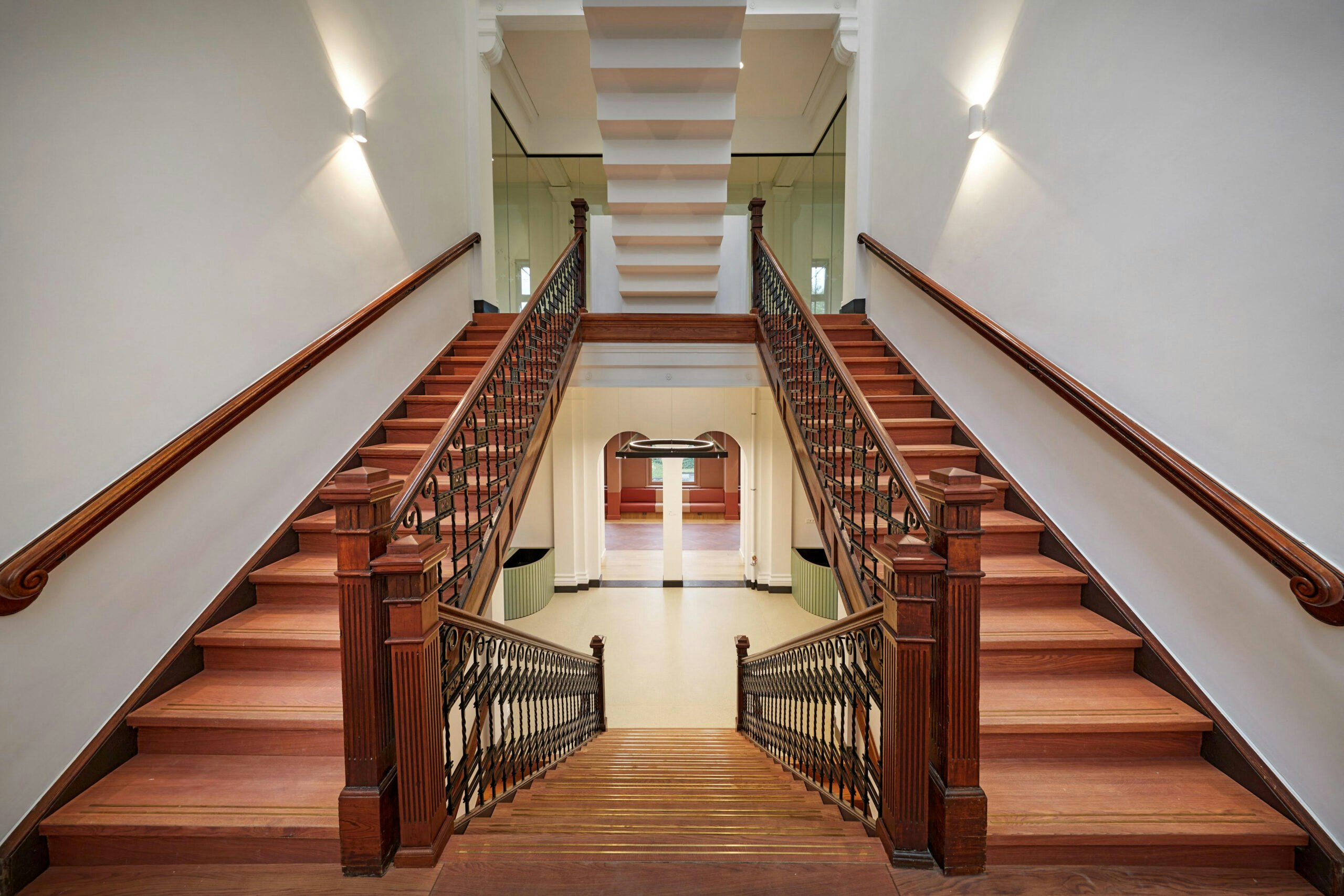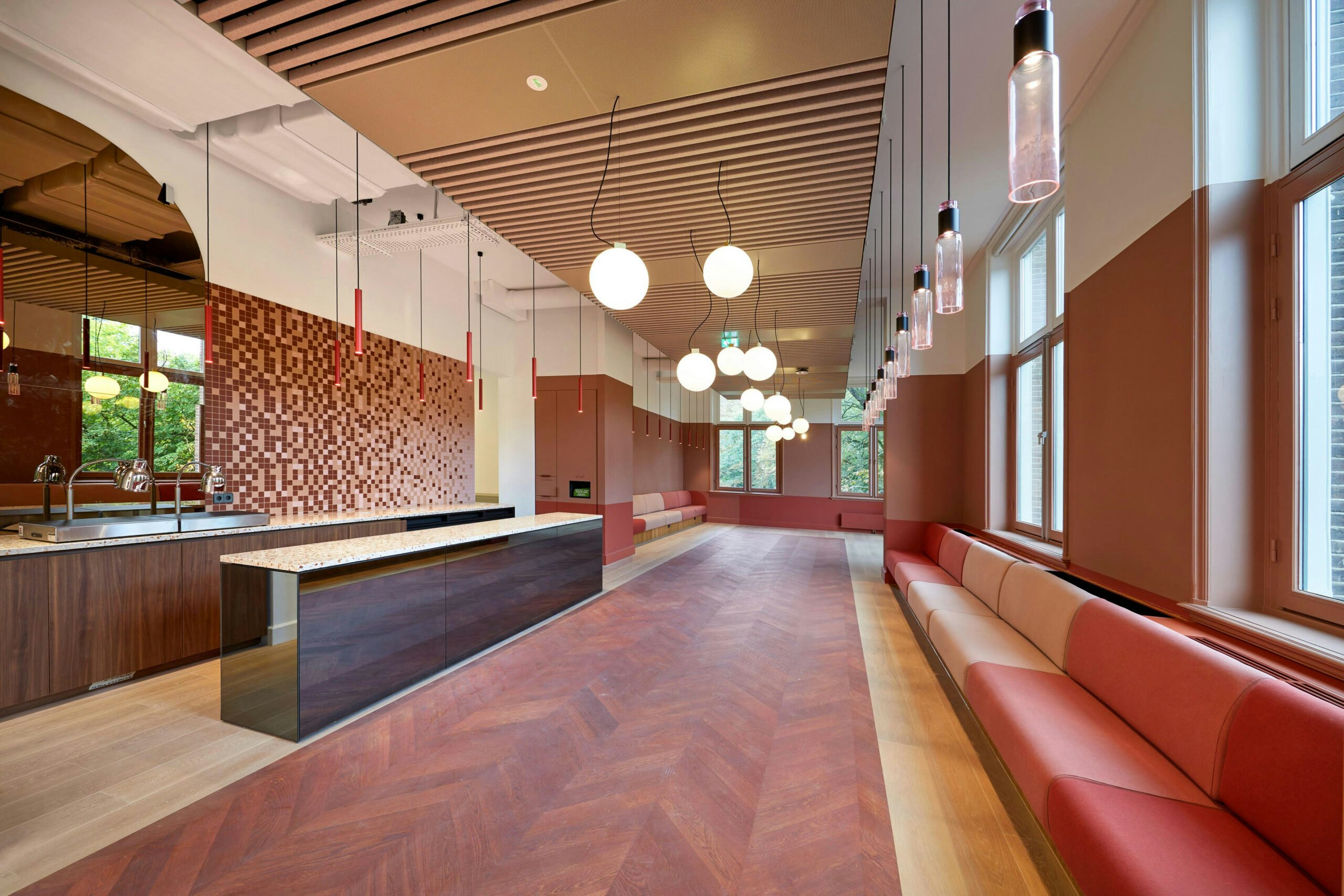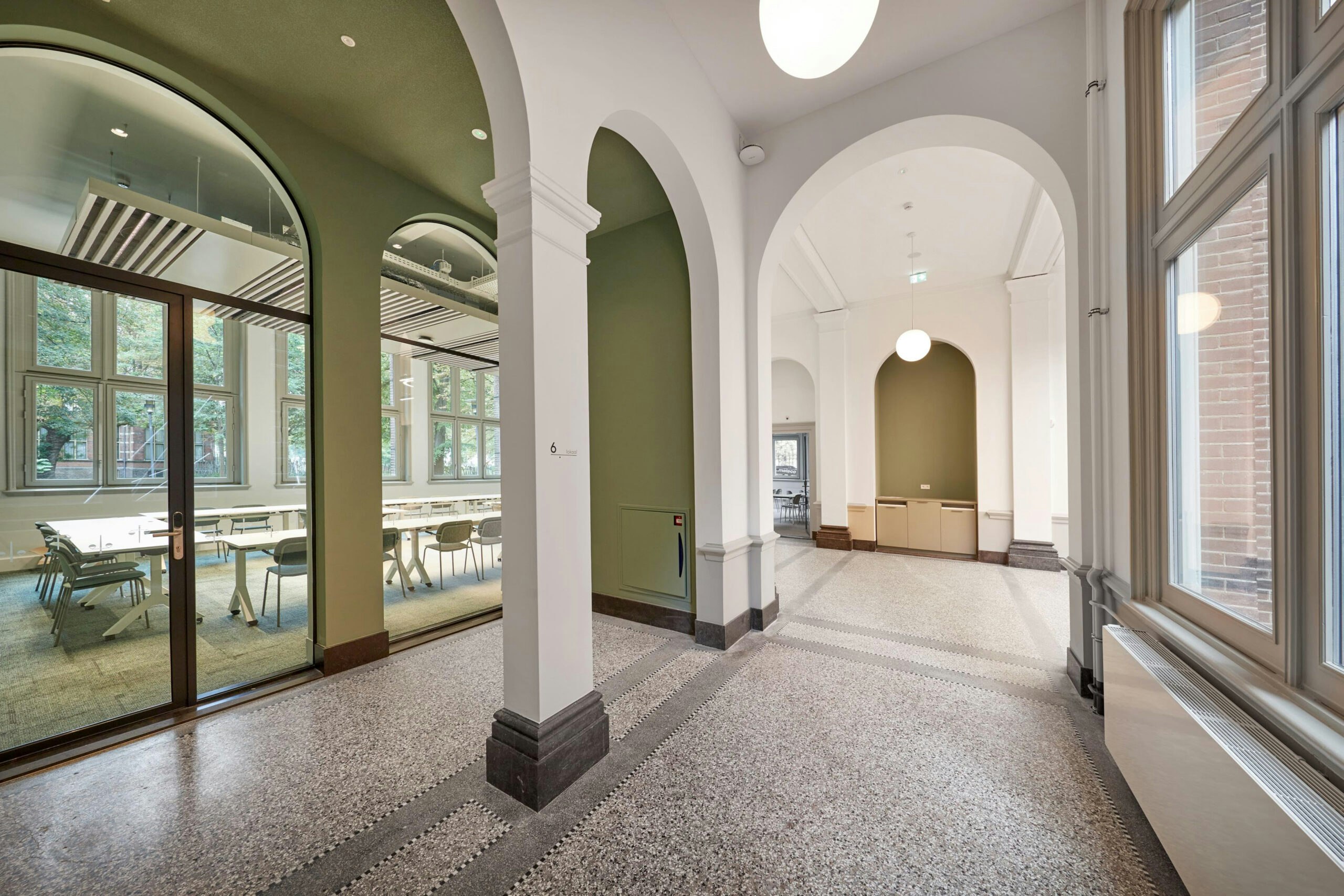 In opdracht van het Rijksvastgoedbedrijf heeft bouwbedrijf J.P. van Eesteren het pand volledig gerenoveerd, verduurzaamd en heringericht. Patrick Gijzen, projectmanager bij J.P. van Eesteren, vertelt dat er een geheel nieuwe inrichting nodig was voor deze nieuwe bestemming. “Het pand is nu voorzien van cursuslokalen, twee oefenrechtbanklokalen en werkplekken. Maar ook een mensa (kantine, red.), keuken en studio’s waar video- en audio-opnamen voor digitaal onderwijs, waaronder webcolleges en talkshows, kunnen worden gemaakt.”