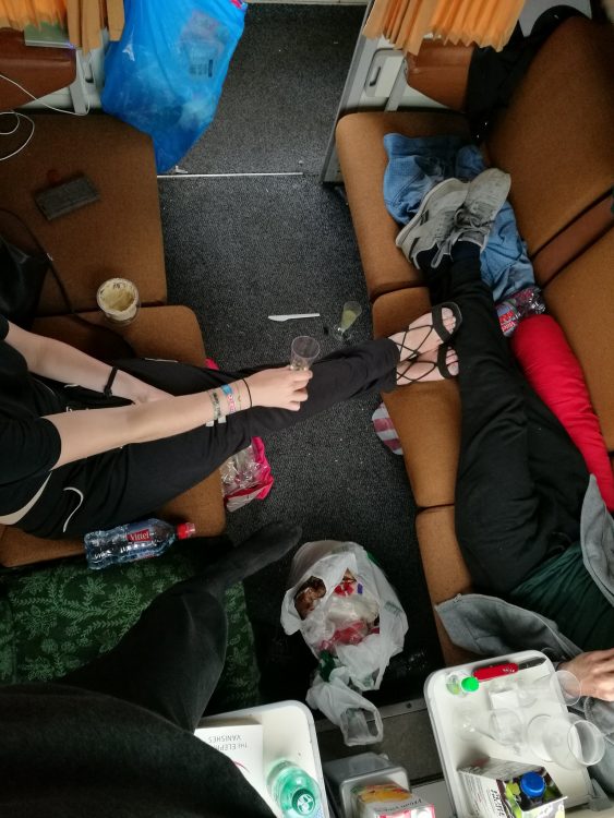 Zondagochtend om half acht, ruim achttien uur vertraagd, kwam de trein met zijn vermoeide passagiers eindelijk aan in Utrecht. “Iedereen was gisteravond lichtelijk aangeschoten, dus de meesten hebben uiteindelijk nog best veel geslapen”, zegt passagier Roos Grinwis tegen DUIC. De trein had als eindbestemming Amersfoort, maar maakte bij uitzondering een extra stop in Utrecht. Roos: “Het was wel een aangename verrassing dat ze ons wakker maakten en zeiden: Hé guys, we stoppen in Utrecht!”