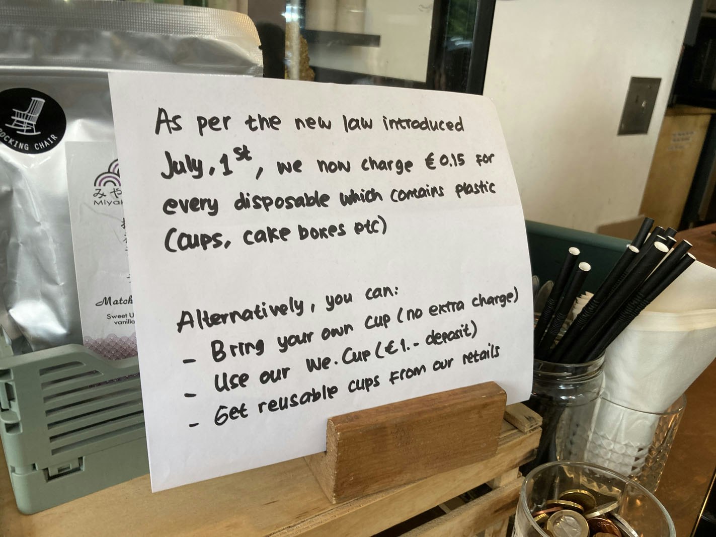 We namen de proef op de som en gingen een rondje koffie halen. Een espresso, om mee te nemen, bij Broodnodig aan de Mariaplaats. We betaalden niks extra’s en het bedrag stond dus ook niet op de bon vermeld. De medewerker achter de bar wist ook van niks. Saskia, de dochter van de eigenaar legt aan de telefoon uit dat ze ook niet heel erg staat te springen om de nieuwe regel door te voeren. “Ik ben het er ergens wel mee eens, maar er zijn ook veel grotere onderwerpen die ze eerst kunnen aanpakken. Denk maar aan fast fashion, als ze die industrie aanpakken halen ze veel meer milieuwinst. Bij dit soort onderwerpen lijken ze de grootste boosdoeners nooit aan te pakken.” Ze gaat de regel overigens wel invoeren, maar is nog aan het bedenken hoe. Ze wil namelijk liever niet de prijs verhogen voor klanten. “Wel zijn we bezig met een statiegeldsysteem voor bekers.”