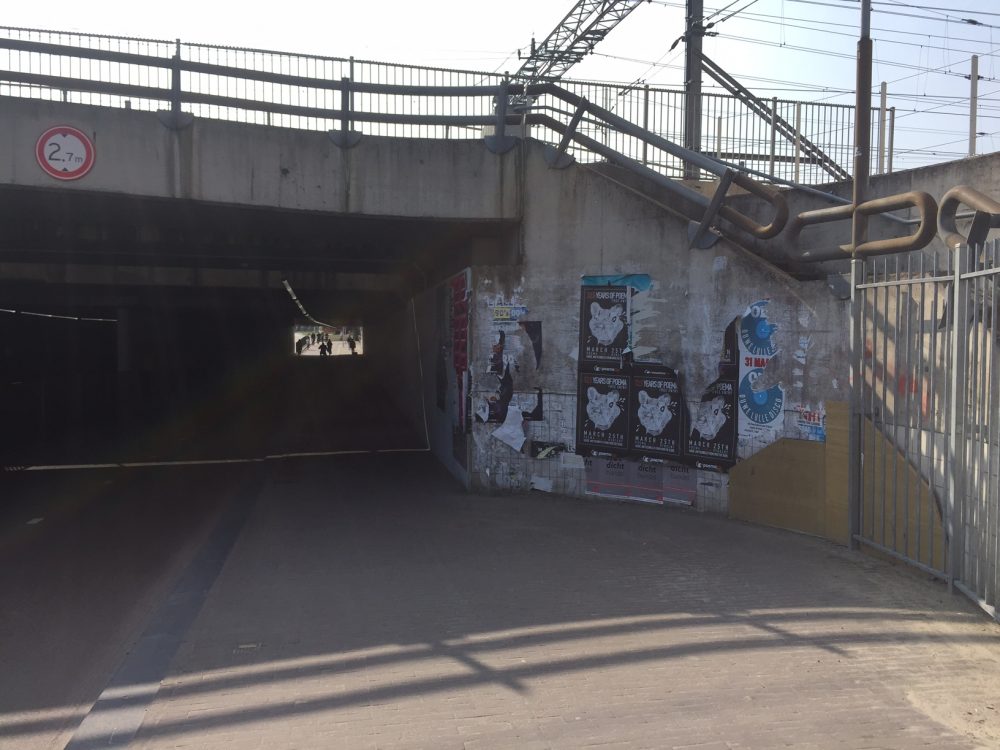Het fietspad met glad asfalt rijdt anders heerlijk, maar daar blijft het verder bij. Dat schaamwandje van plastic panelen met CU2030 = FANTASTISCH+GEWELDIG staatspropaganda zijn doodleuk overgeschilderd en rotten nu langzaam verder. De voetgangersbrug is afgesloten met een supergezellig traliehek met punten. Oud hekwerk van lichtblauw geschilderd siersmeedwerk met dezelfde vormentaal als de tunnel: verdwenen. Inclusief de natuurstenen kopstukken met reliëf uit de tijd van Van Ravesteyn.