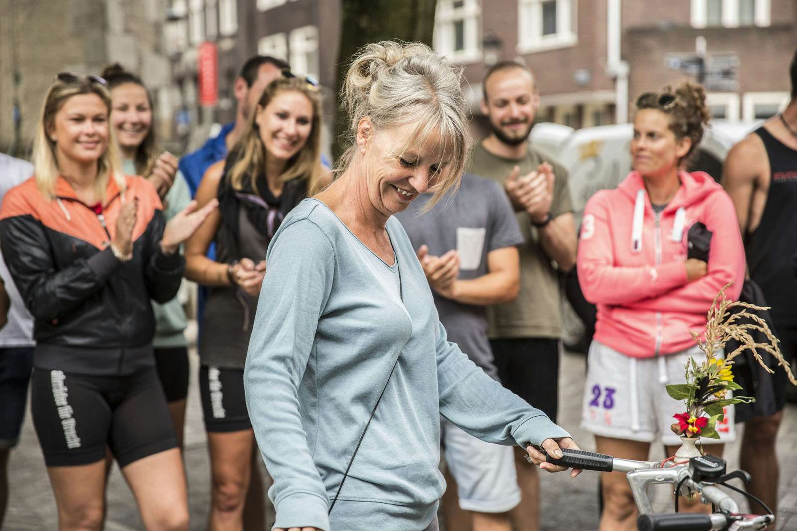 Heel veel publiek is er niet aanwezig als de groep Duitsers om klokslag tien uur arriveert bij Carla’s Conditorie op Achter de Dom. Maar dat mag de pret niet drukken. Gekleed in sportieve outfits stappen de fietsers van hun stalen ros, die ze volgens de planning zullen doneren aan de lokale afdeling van Vluchtelingenwerk Nederland.