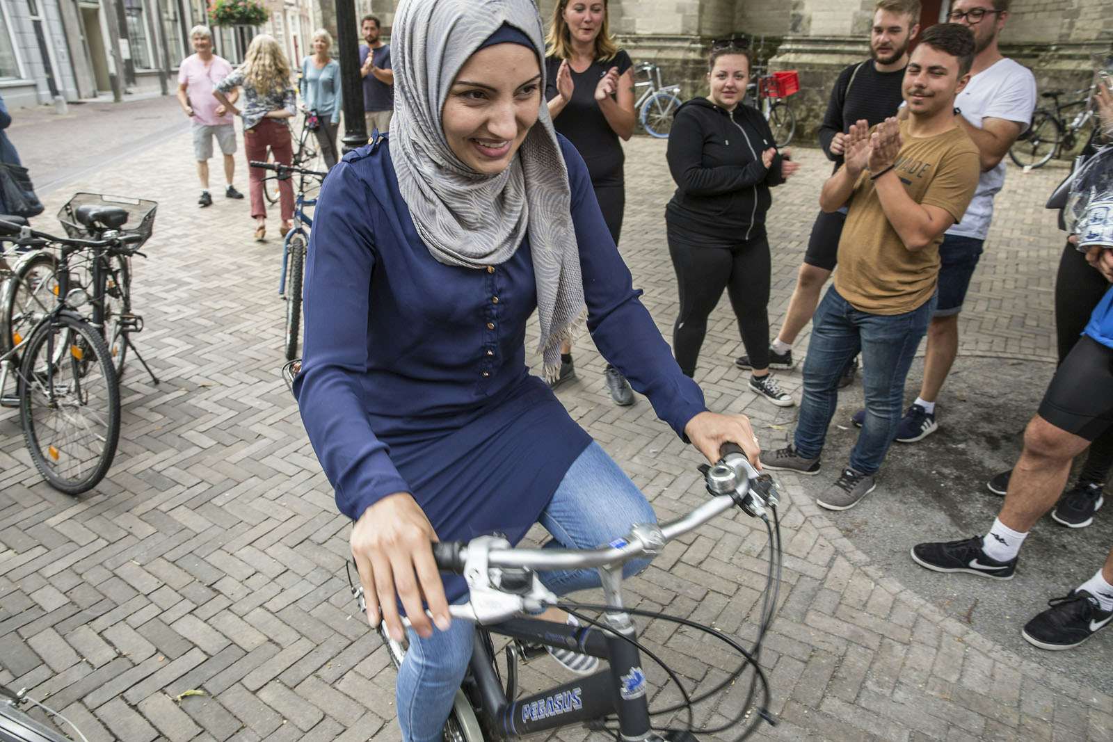 Maar voor dat gebeurt doet de groep eerst nog de fietsendans, een flashmob op muziek. ‘Fietsen coming home’ klinkt er uit een speaker. Na een kort woordje van de Duitse initiatiefnemer Jochen Baier wordt één van de fietsen uitgereikt aan een willekeurige voorbijganger. Vervolgens mogen de aanwezige vluchtelingen van Vluchtelingenwerk Nederland een fiets uitkiezen. Al glimlachend maken ze de eerste testritjes, terwijl ze de Duitsers uitvoerig bedanken.