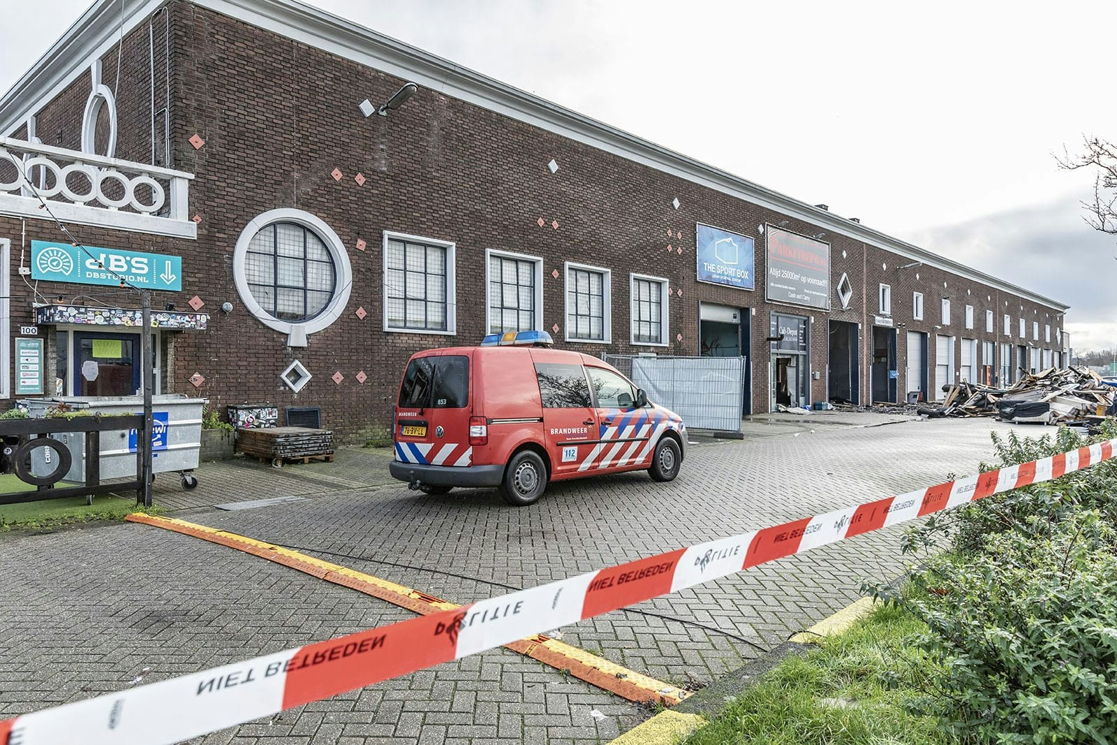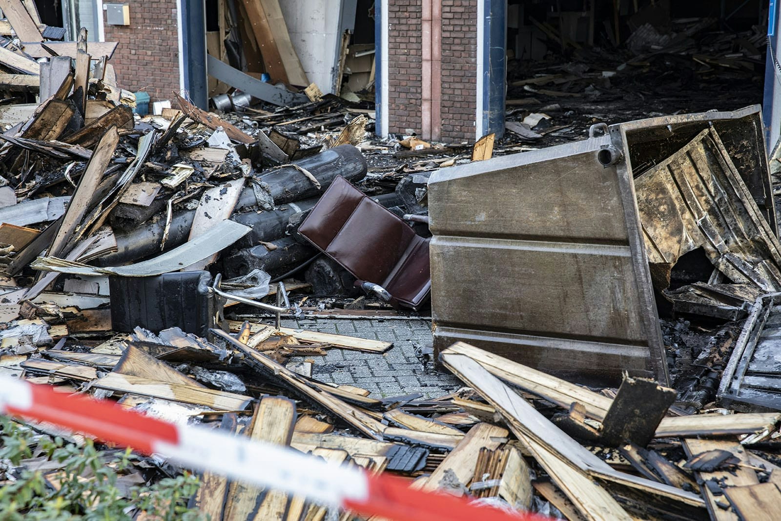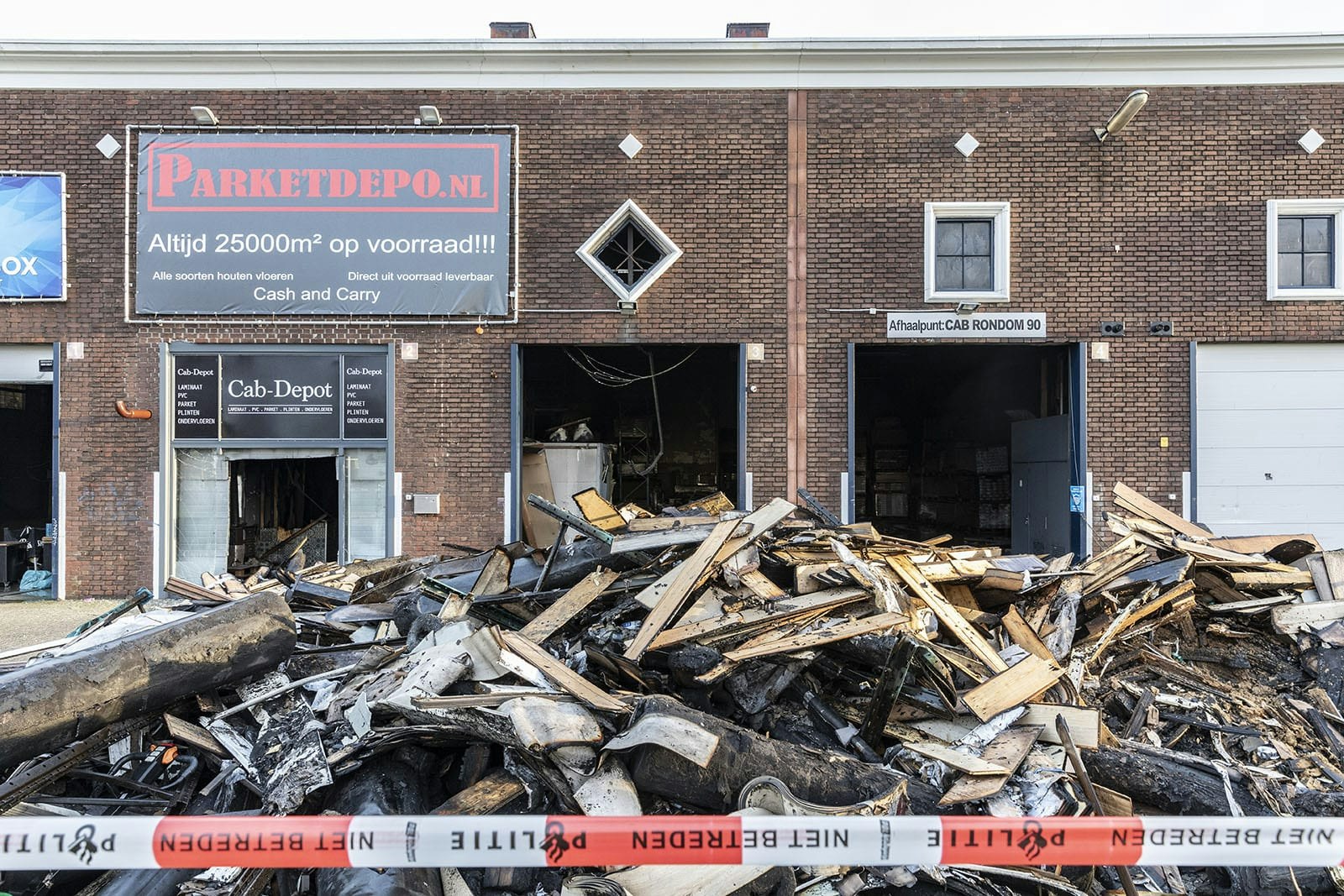 De geur van de brand is ook dinsdagochtend nog in de wijde omtrek te ruiken. Op het terrein van het CAB-gebouw ligt een berg losse spullen die door de brandweer met een kraan uit het pand zijn gehaald om ze te kunnen blussen. Het gaat onder meer om een grote voorraad laminaat van een parketdepot, een van de bedrijven in het pand.