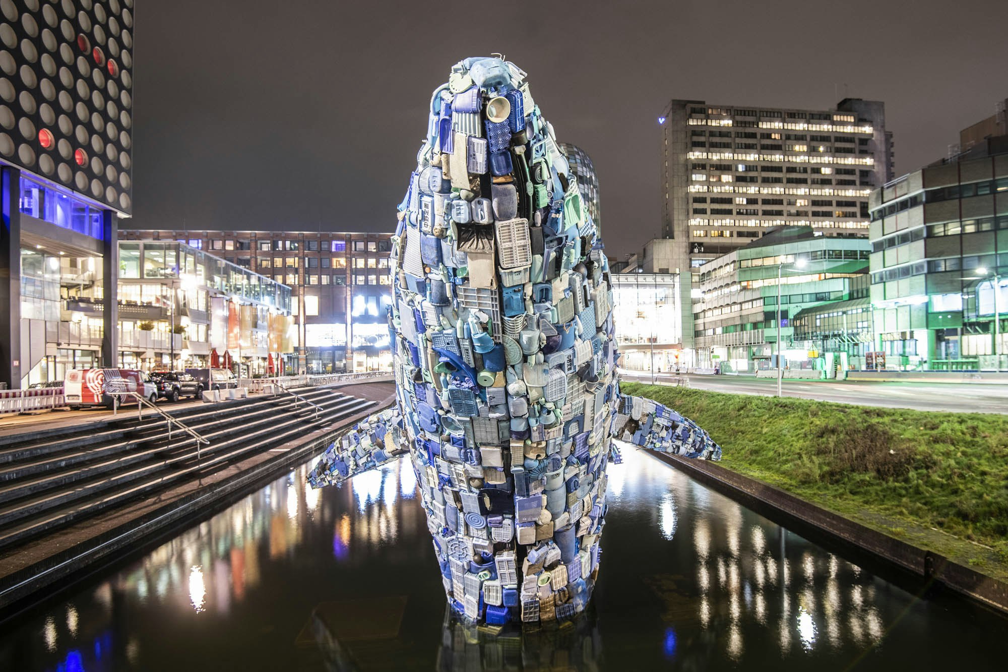 De twaalf meter hoge plastic walvis in de singel bij TivoliVredenburg heeft heel veel bekijks getrokken. Het spectaculaire kunstwerk getiteld Skyscraper kwam er op initiatief van de Universiteit Utrecht. De makers, Studio KCA, willen met het werk aandacht vragen voor de problemen van plastic soep in de oceaan.