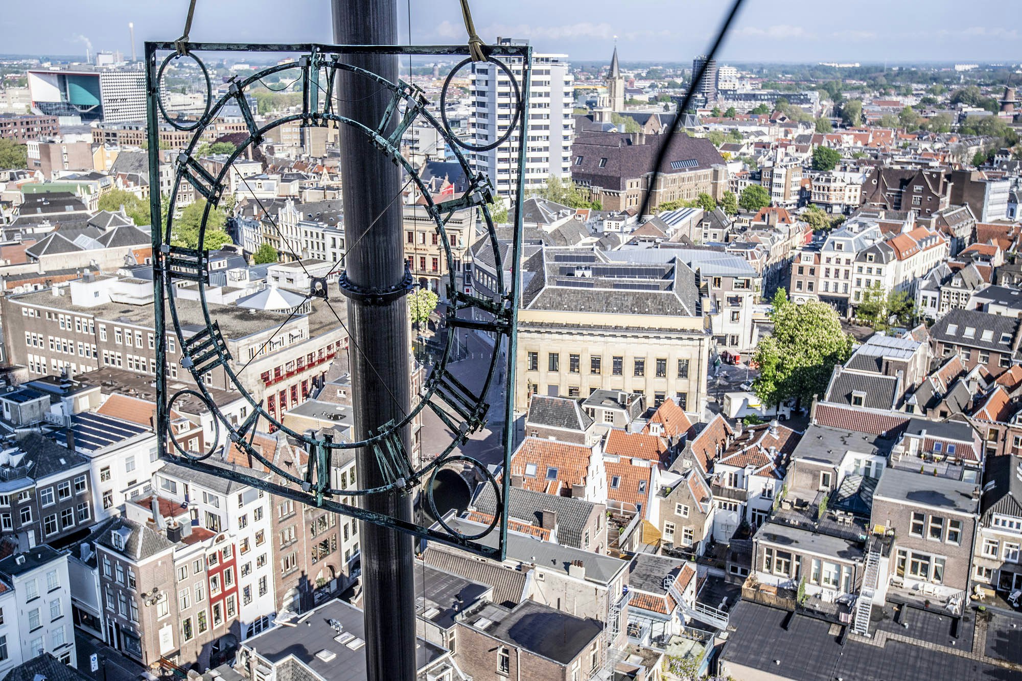De wijzerplaten van de Domtoren zijn verwijderd. Even op de toren kijken om te zien hoe laat het is, gaat voorlopig niet lukken. De platen uit 1915 maken plaats voor de ingrijpende restauratie van de toren. Die gaat nog jaren duren.