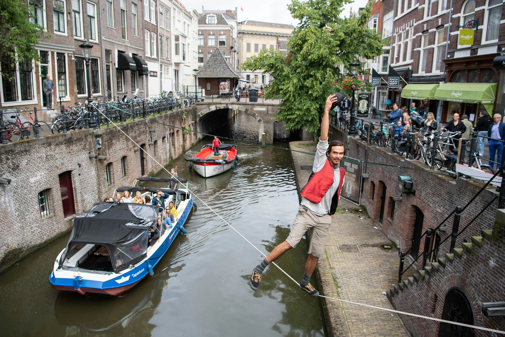 In Utrecht zijn er niet zoveel bijzondere straatartiesten, maar zo nu en dan is daar ineens Sebastian Gumchung. De Amerikaan balanceert dan op zijn gemakje een paar uurtjes boven de Oudegracht. Hij is een bekende verschijnsel in de binnenstad en haalt nooit een nat pak.