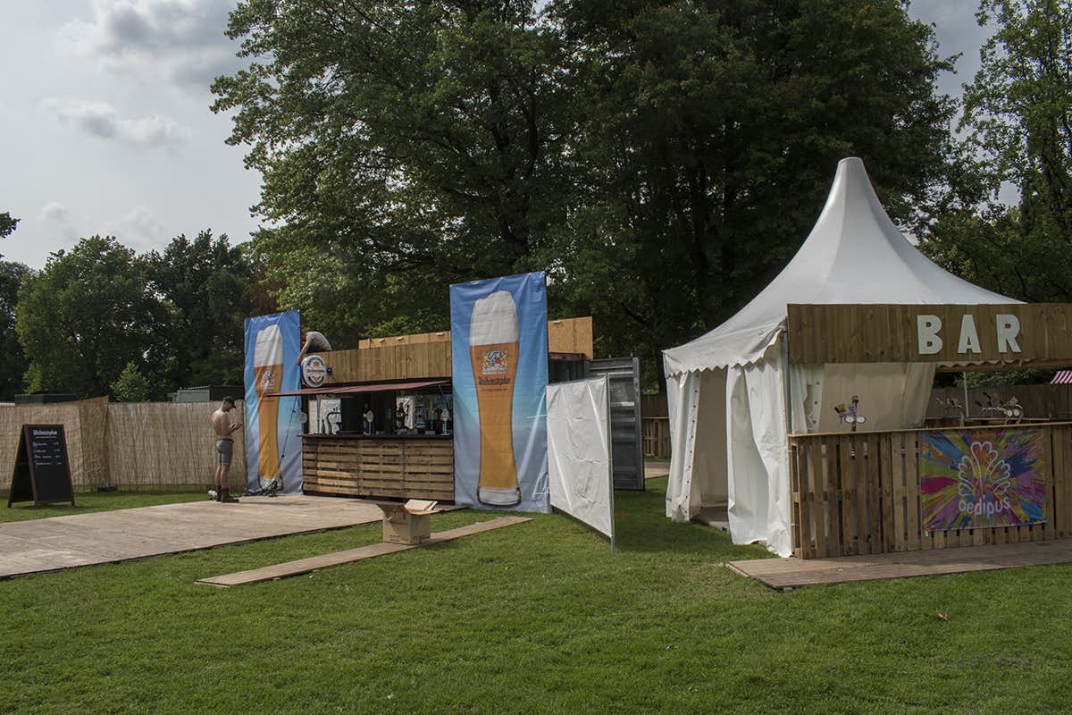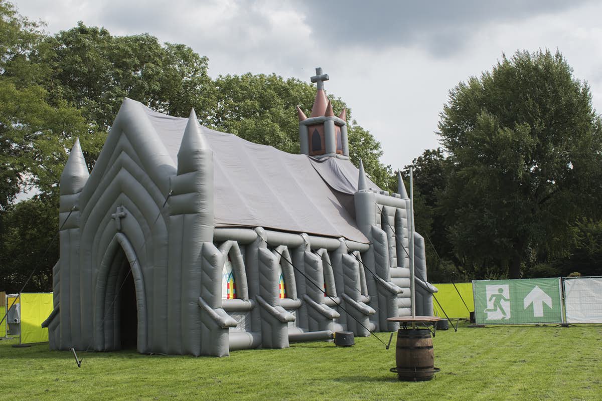 Op het festivalterrein zijn de voorbereidingen in volle gang. Het podium is opgebouwd en ook de opblaasbare kerk staat er al. Een aantal mensen is druk in de weer om ervoor te zorgen dat een feestende menigte morgen en zondag kan genieten van allerlei verschillende soorten bieren.