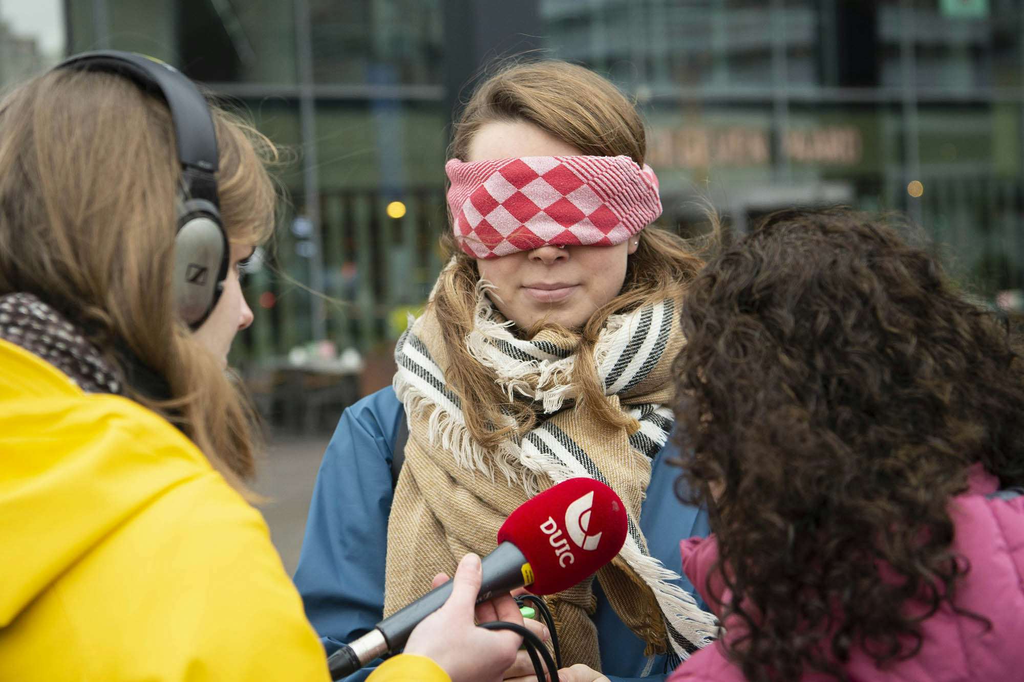 Foto 2. V.l.n.r.: Mirte met microfoon in de hand, Bo met blinddoek voor en Nursel die uitlegt hoe de taststok werkt.