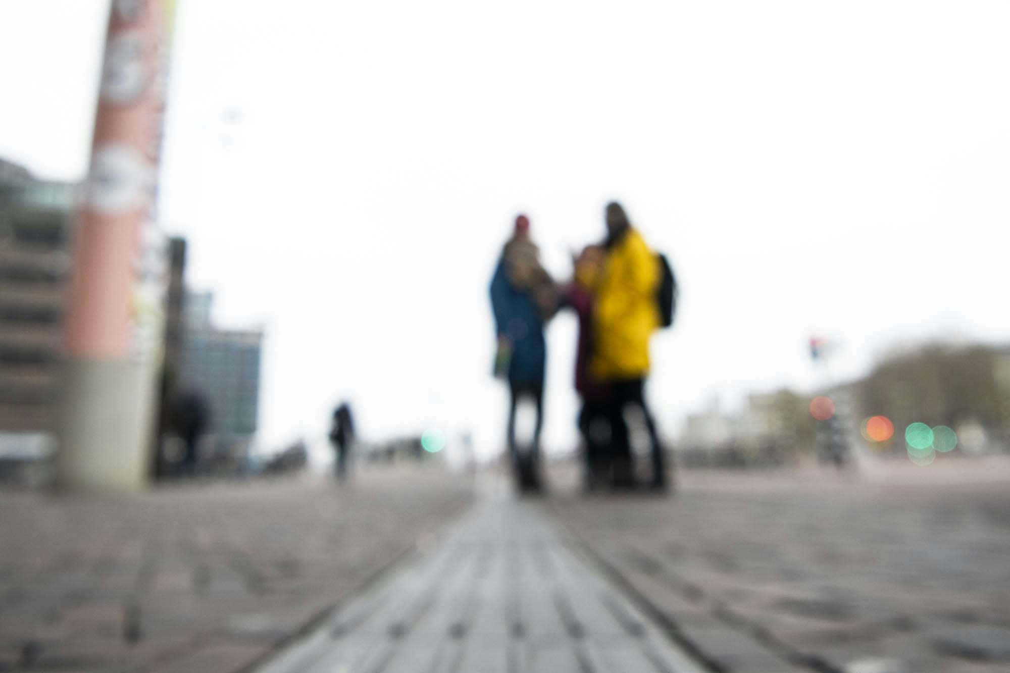 Foto 7: Een wazige foto met Bo, Nursel en Mirte langs een geleidelijn.