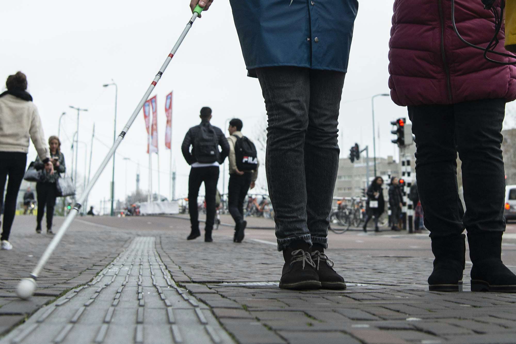 Foto 5. Foto is gemaakt vanaf de grond. Je ziet de benen van Bo en Nursel en de taststok die over de geleidelijn beweegt.