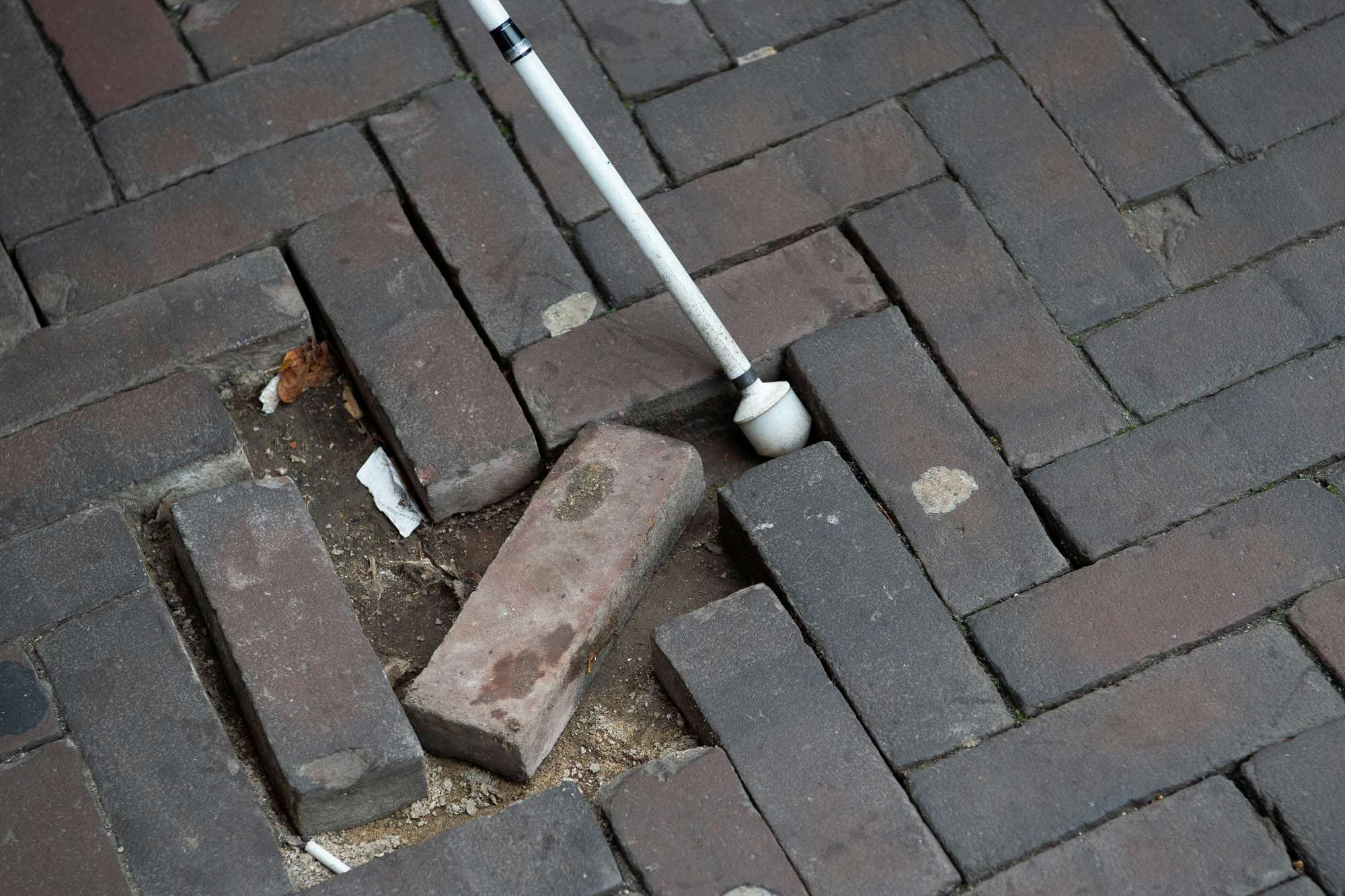 Foto 3. De taststok loopt vast tussen losliggende stoeptegels.