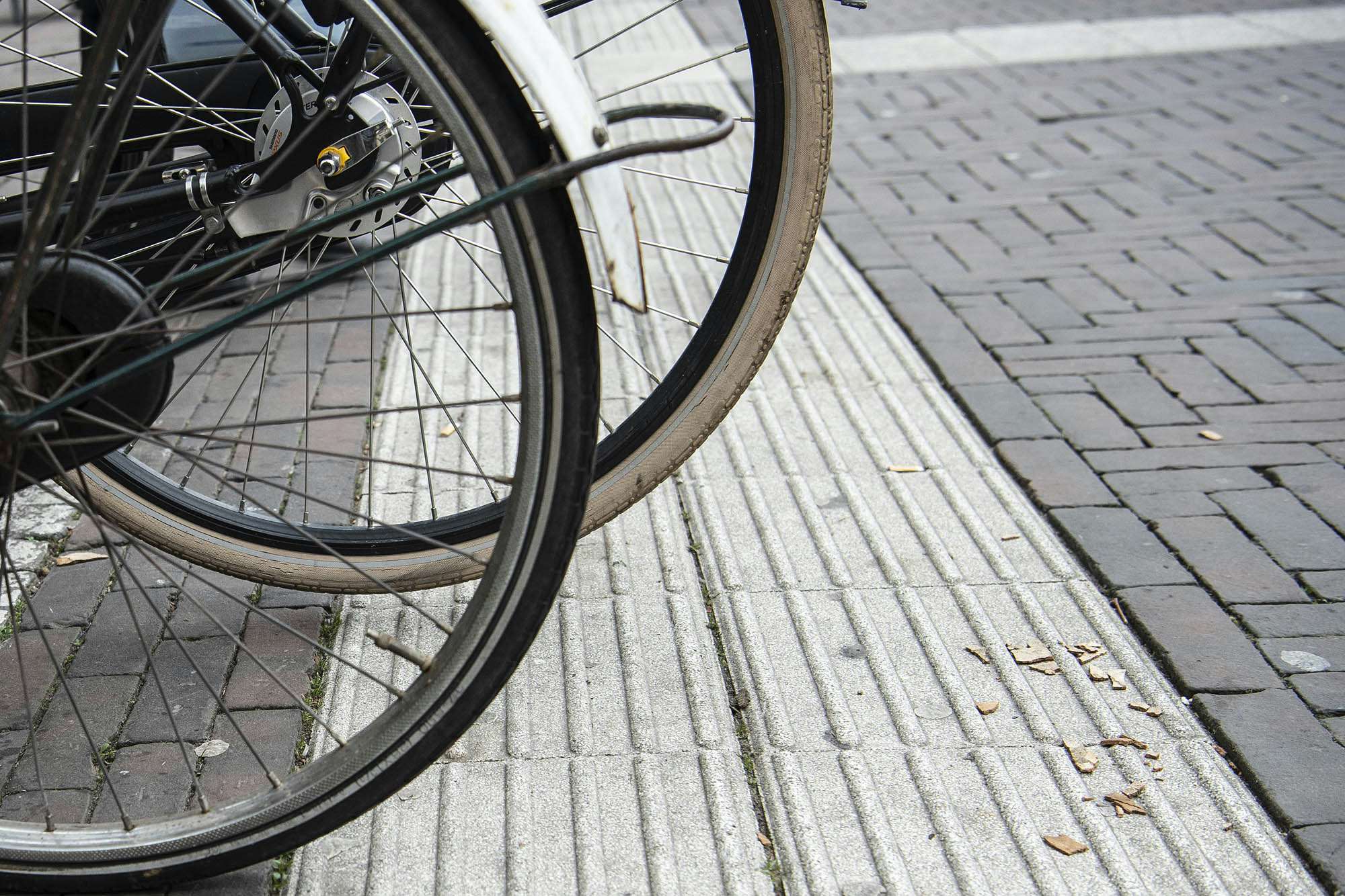 Foto 6. Er staan 2 fietsen met hun wiel voor een deel op de geleidelijn.