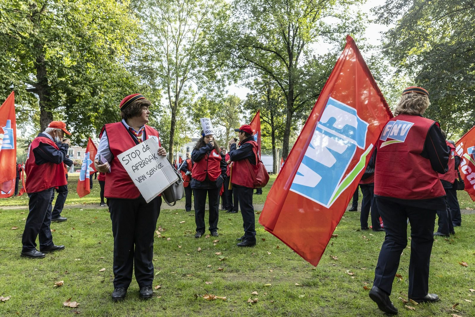 Honderden medewerkers van NS demonstreerden woensdag in het Moreelsepark in Utrecht. Een deel van de mensen protesteerden voor loonsverhoging en een ander deel omdat NS van plan is het aantal bemande servicebalies te verminderen.