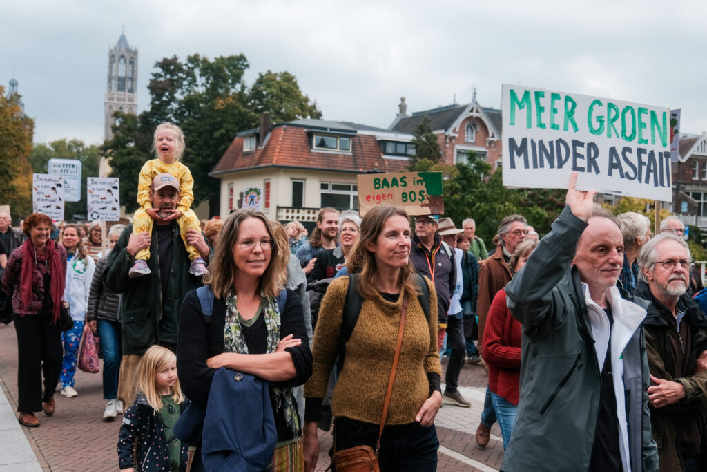 Honderden mensen kwamen zondag bijeen in de binnenstad van Utrecht om te protesteren tegen de verbreding van de A27 en de bijbehorende bomenkap. De demonstranten liepen vanaf het Domplein in een protestmars door het centrum.