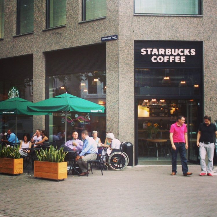 We drinken dit seizoen voor het eerst koffie op een terras! Koffietentjes en buiten zitten gaan blijkbaar niet heel goed samen in Utrecht. Gelukkig biedt deze Starbucks wel de mogelijkheid. Het uitzicht is niet het allermooist en we zitten recht voor een laad- en losgebied, maar als je om de vrachtwagens heen kijkt, zijn we zeker tevreden. Het voelt eigenlijk wel extra vakantieachtig zo, alsof we net uit het vliegtuig zijn gestapt en in een nieuwe grote wereldstad zijn beland. Dit wordt nog versterkt door de groep Italianen die naast ons zit, staat en stuitert. Grappig dat juist zij naar een zo Amerikaanse koffietent komen.