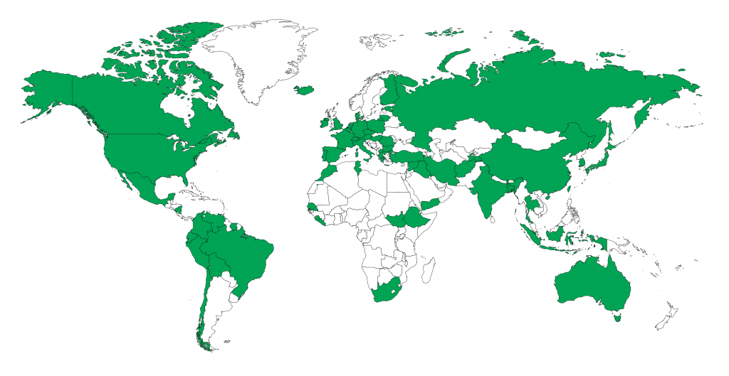 Afghanistan, Aruba, Australië, Bangladesh, België, Bolivia, Brazilië, Bulgarije, Canada, Chili, China, Colombia, Curaçao, Denemarken, Duitsland, Ecuador, Engeland, Estland, Ethiopië, Finland, Frankrijk, Griekenland, Hongarije, Ierland, India, Indonesië, Irak, Iran, Italië, IJsland, Japan, Jemen, Liberia, Litouwen, Macedonië, Marokko, Mexico, Nicaragua, Noord-Ierland, Oostenrijk, Peru, Polen, Portugal, Roemenië, Rusland, Senegal, Sierra-Leone, Spanje, Suriname, Syrië, Tadzjikistan, Taiwan, Thailand, Tsjechië, Tunesië, Turkije, Venezuela, Verenigde Staten, Zuid-Afrika, Zuid-Korea, Zuid-Soedan en Zwitserland.
