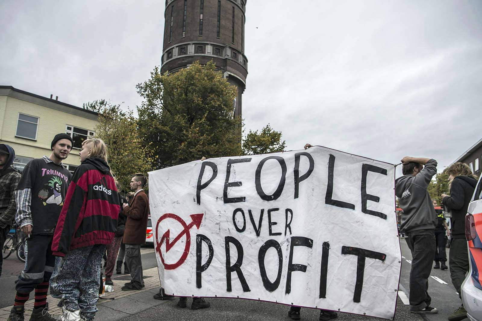 People over profit ! Yes! Alleen jammer dat sinds de jaren negentig de kraakbeweging ook is geïnfecteerd met de ” me first and the giveme giveme’ ziekte (naast de drugs) en nog maar weinig inhoudelijke body heeft. Maar goed , wellicht is dit weer een revival! Mooie statement boys & girls!