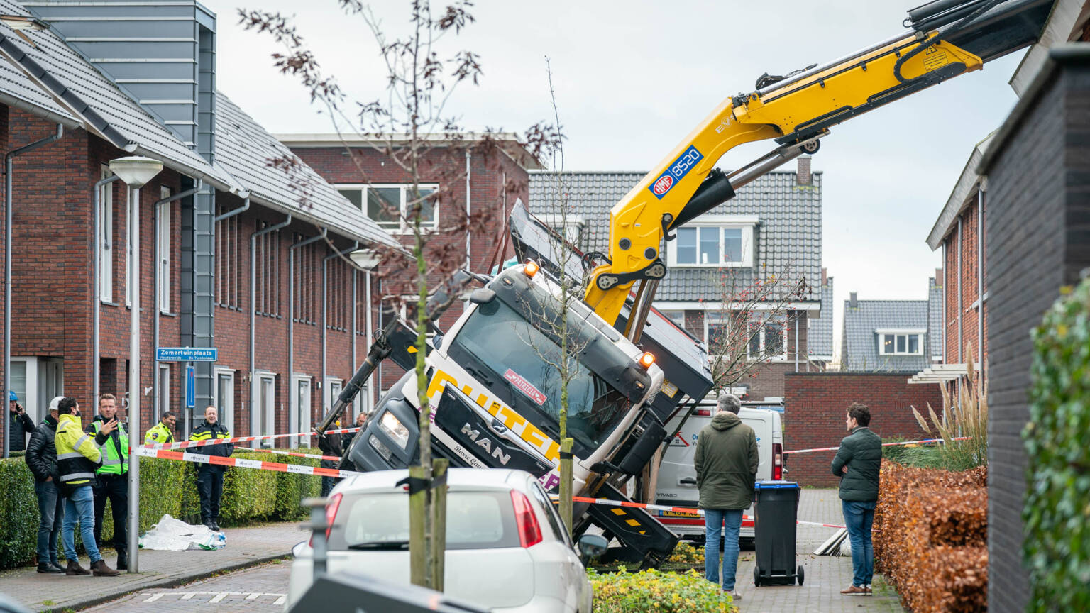 Een van de zogenoemde stempels, waar het voertuig op leunt, zakte door het wegdek. Hierdoor viel de kraanwagen om met de arm van de kraan op een woning. Op foto’s is te zien dat het dak van zeker één woning beschadigd is geraakt.
