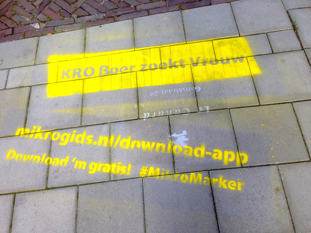 Een vrij onschuldige boodschap, maar het is niet toegestaan. Mikro Gids, de televisiegids van de KRO, heeft in zes verschillende steden met spuitverf reclameboodschappen op stoepen gespoten. Ook in Utrecht is deze felgele reclame te vinden.