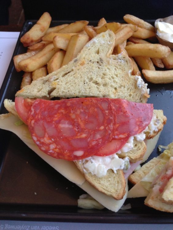 Op de kaart staat de CS beschreven als een Clubsandwich geserveerd met friet. En die friet is heerlijk. Goed, knapperig gebakken en met lekkere mayonaise. De CS bestaat netjes uit 3 lagen. Helaas is het brood niet geroosterd, en liggen er een aantal ingrediënten op de CS die ik nog niet eerder ben tegengekomen. Zo zit er op de toplaag huzarensalade, chorizo en tomaat. De tomaat had ik eerder voorbij zien komen, maar chorizo en huzarensalade niet. Op de tweede laag zit kaas, een plakje ham en sla. De combinatie van deze ingrediënten smaakt overigens behoorlijk. Ik mis alleen wel een eitje, bacon en kip of kalkoen welke redelijk essentieel zijn voor een klassieke CS. De ingrediënten zijn verder niet speciaal. Het doet mij sterk denken aan de CS die ik een jaar geleden at bij Buurten. Ook hier lijkt de leverancier de AH te zijn en is de CS makkelijk thuis na te maken. Voor €9,50 is dit zeker te doen.