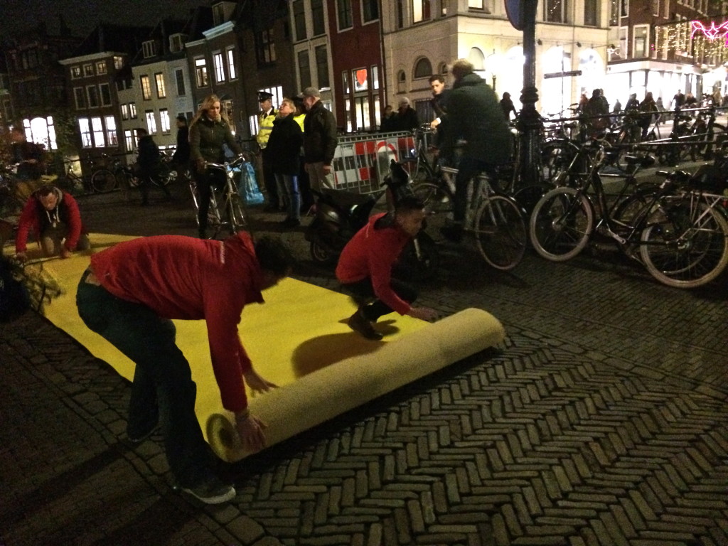 Om half zeven is het nog rustig in het centrum. Van La Nuit Du Tour is op de Oude Gracht en de Steenweg weinig merkbaar, op een Skoda met Tour de France-bestickering en blonde promotiemeisjes met rode windjacks na. Op de Vismarkt wordt het eerste deel van de gele loper uitgerold, de loper die de stad na de grote stunt geel kleurt.