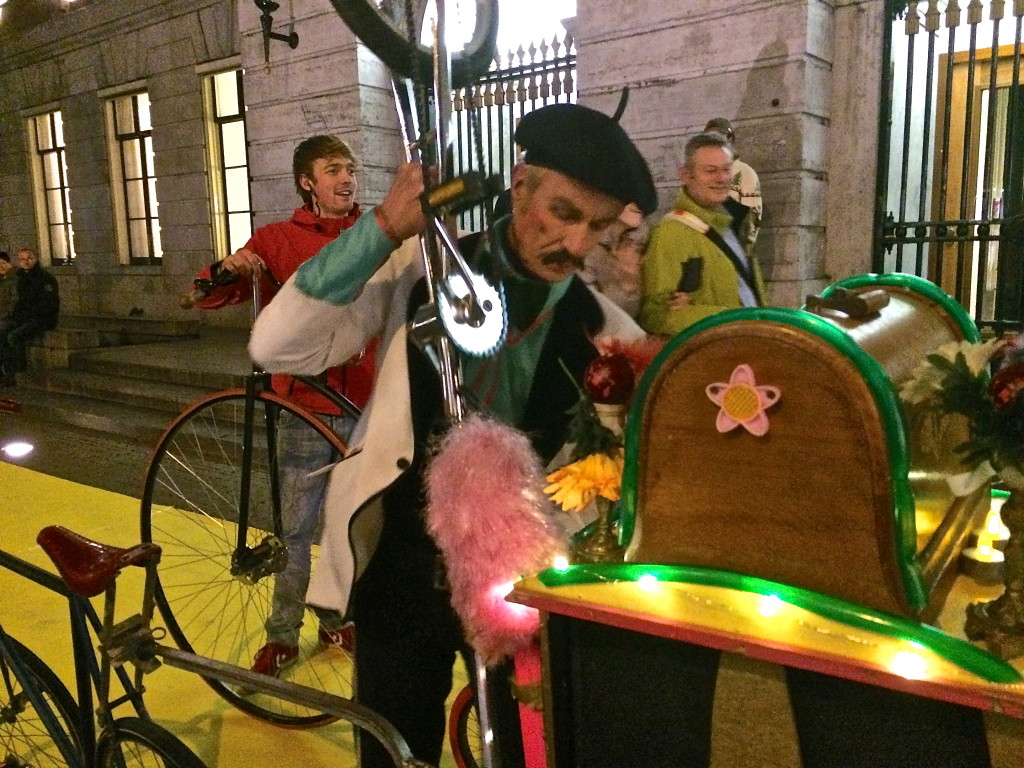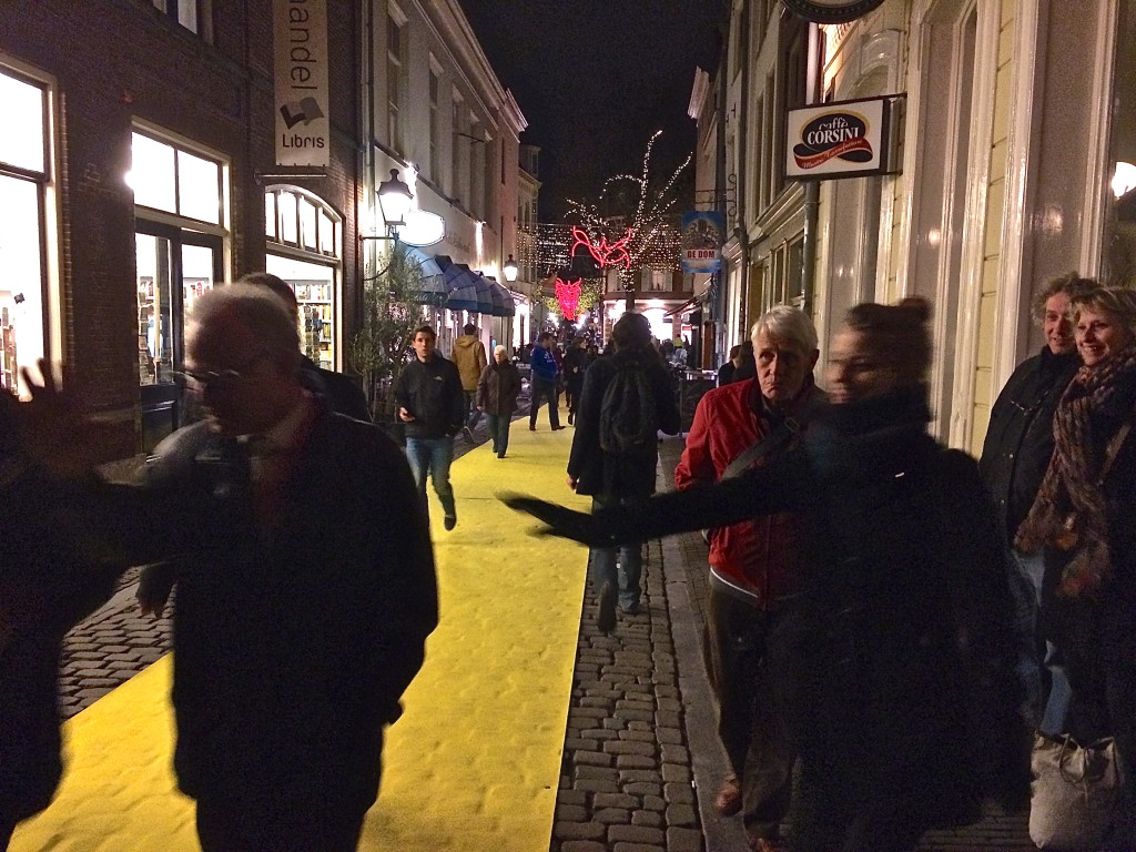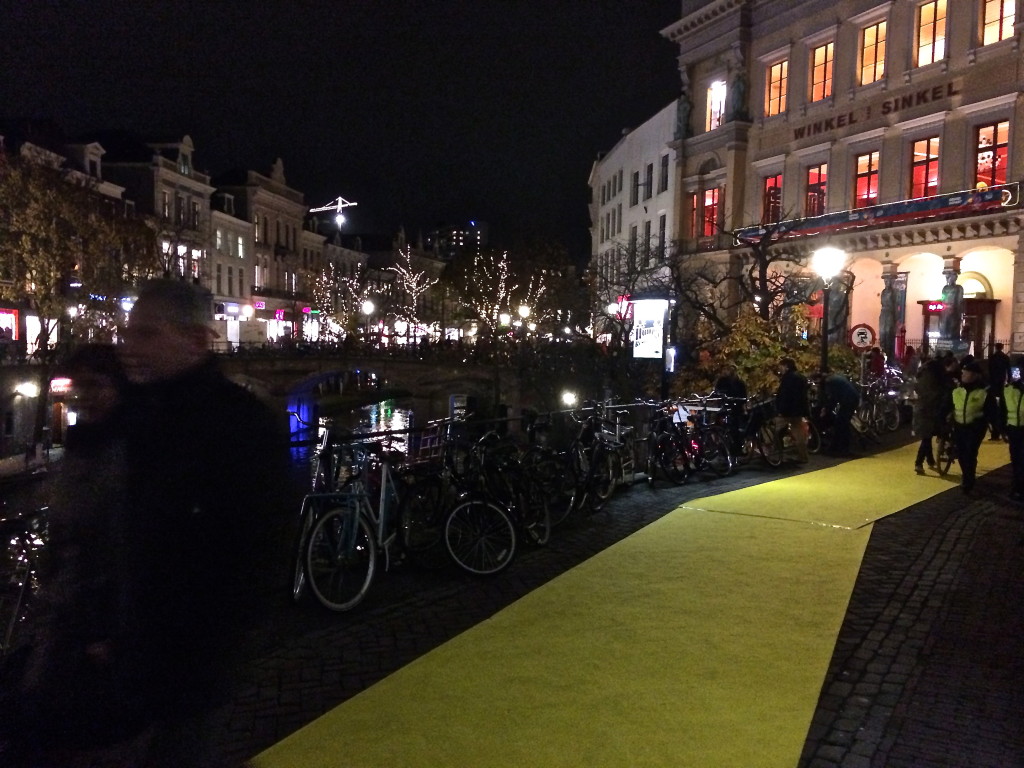 Na de grote stunt kleurt de Dom rood-wit-blauw. “Geniet nog even na van de muziek van Bakermat”, deelt Erik het publiek mee. Het plein loopt al gauw leeg. Niet door de muziek, maar door nieuwsgierigheid over wat er in de rest van de stad gebeurt. Kriskras door het centrum, van de Dom tot het Vredenburg, is de gele loper uitgerold. Langs de loper vermaken verschillende acts het veelal en passant passerende publiek. Twee blaasorkesten, een Frans chansonduo en twee Fransen op een eenwieler verzorgen niet het vervolg waarop het grote publiek gewacht had. De stad is na acht uur dan ook redelijk stil. Het is wachten op Bakermat, die om 22.00 uur in de Winkel van Sinkel de één uur durende afterparty verzorgt.