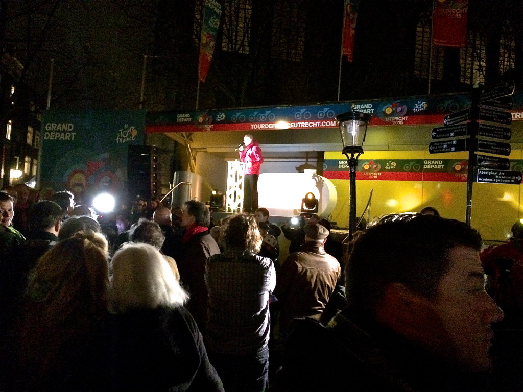 DJ Bakermat, bekend van de hits Zomer en Vandaag, draait zijn plaatjes, terwijl tientallen mensen langzaam maar zeker hun weg weten te vinden naar het Domplein. Daar ging om 19.00 uur, met een grote stunt, La Nuit du Tour van start. Een avond boordevol festiviteiten als voorproefje op wat Utrecht in 2015 te wachten staat: “De start van het grootste sportevenement ter wereld”, zoals burgemeester Aleid Wolfsen dat tijdens zijn onvoorbereide speech verkondigt. De stad kleurt geel en viert feest.