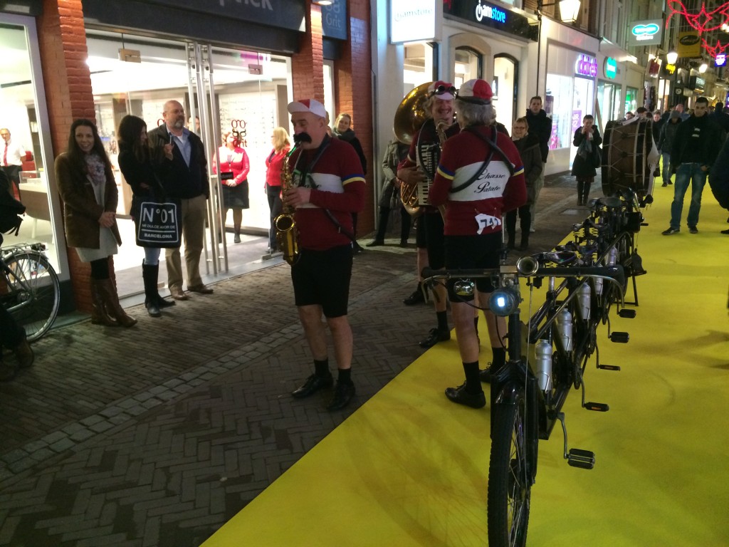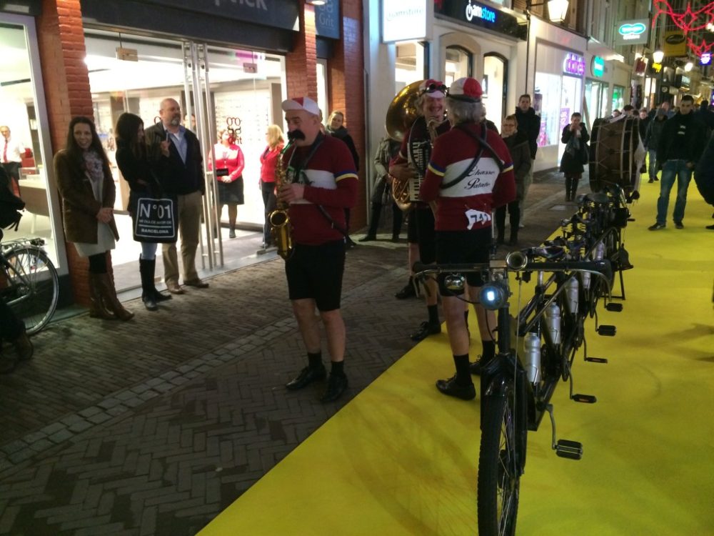 Voordat het zover is, vraagt Van Welzen Aleid Wolfsen het podium te betreden. “I didn’t prepare this”, zegt Aleid op ludieke wijze. Een enthousiast verhaal over de start van de Tour volgt en de burgemeester komt nog even terug op de etappe die hij eerder die middag op een OV-fiets reed. “Jan Janssen is echt een bijtertje. Hij ging met een banddikte verschil over de finish. Jan is 73, maar hij kon het niet laten.” Dan vindt Wolfsen het tijd voor de stunt.