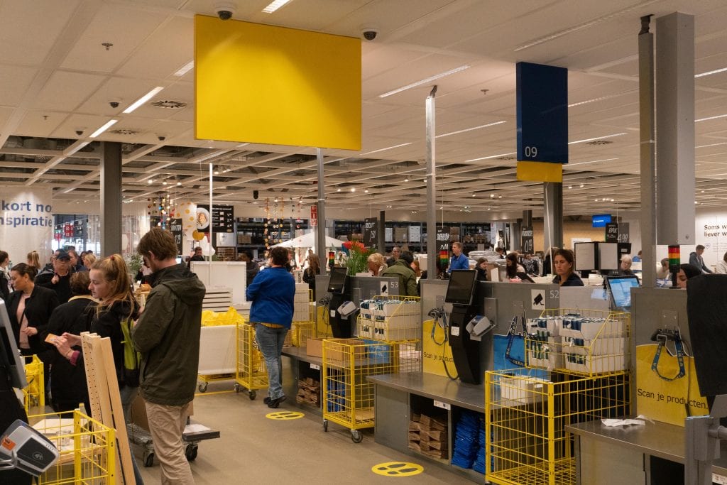 Het is druk bij de heropening van de Ikea op de Utrechtse woonboulevard. De winkel was zes weken gesloten vanwege de coronacrisis maar ging dinsdagochtend weer open. Overal staan medewerkers en beveiligers in opvallende hesjes, die de winkelbezoekers wijzen op de markeringen en speciaal aangepaste routes.