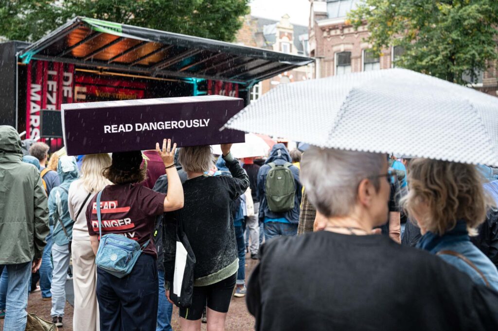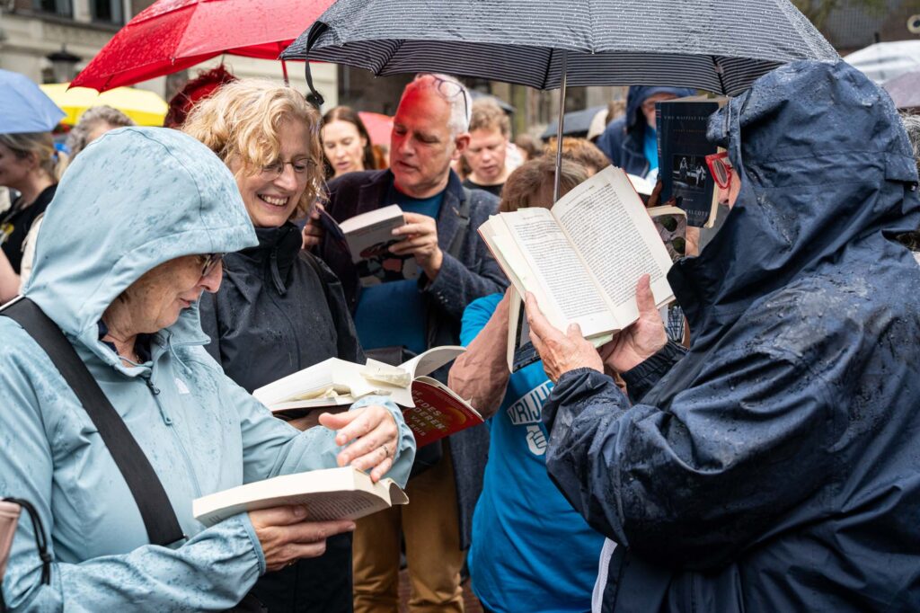 Toen het halverwege de speeches flink begon te regenen, liet de menigte zich niet uit het veld slaan. Aan het einde van het programma schuilde ze massaal bij elkaar onder de paraplu’s, om daar tegelijkertijd een passage uit hun boeken te lezen. Het resultaat; een luid geroezemoes, het geluid van het vrije woord.