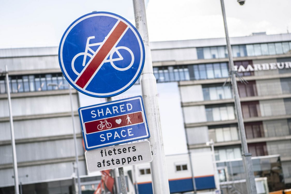 Nu staat er echter weer een nieuw bordje onder de aankondiging voor shared space. De Fietsersbond vraagt zich af wat eraan de hand is. “Shared space en fietsers moeten afstappen. Dat is feitelijk een fietsverbod, toch?”