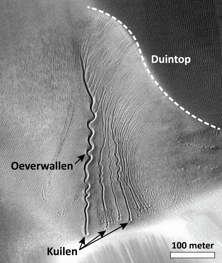 Satellietbeelden van lange geulen die als een soort riviertjes over de duinhellingen op Mars kronkelen, met aan het einde steevast een soort kuiltje. Dat spreekt natuurlijk tot de verbeelding, maar tot voor kort was er nog geen bewijs voor hoe ze ontstaan.