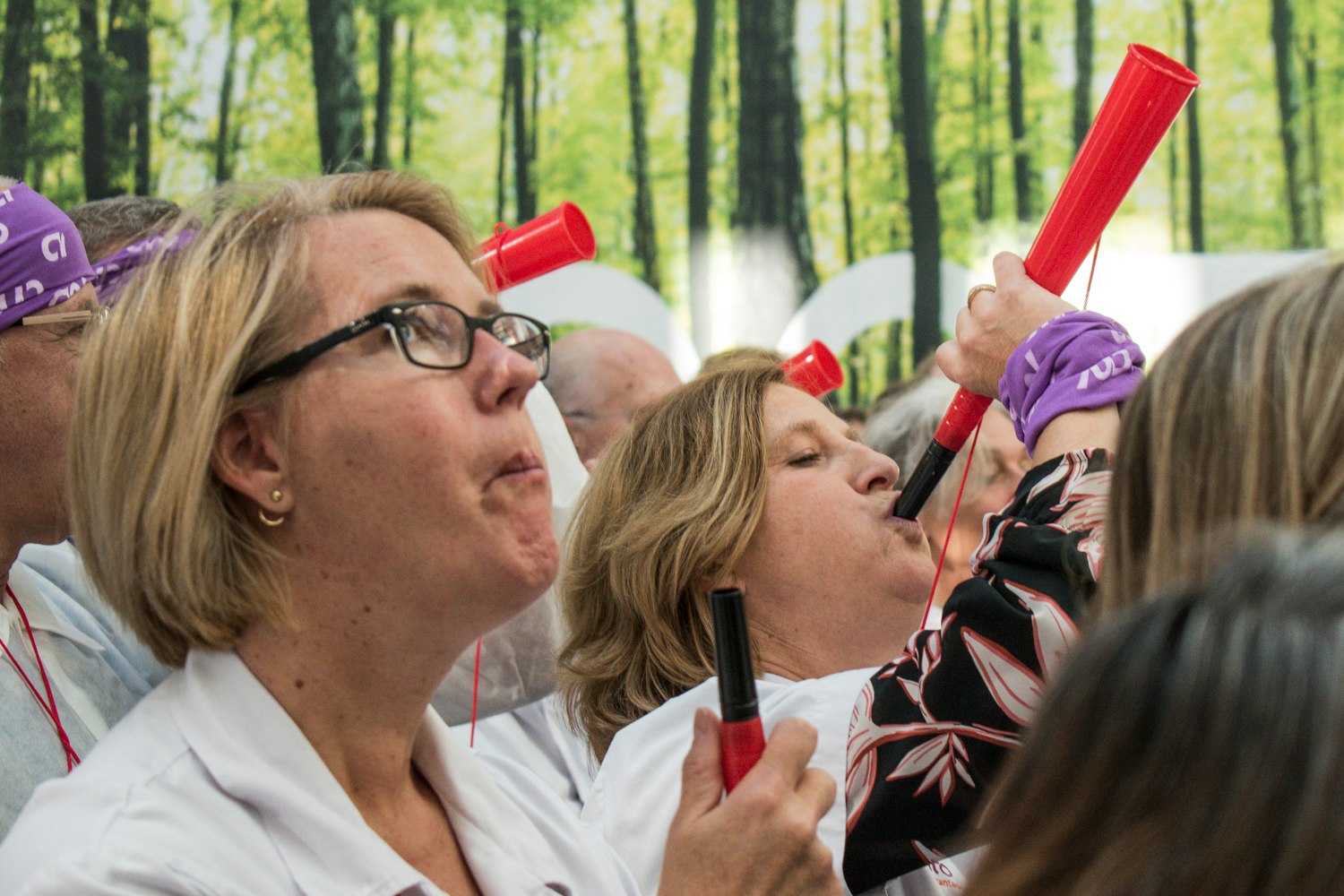 “Actie! Actie! Actie!”, roepen meer dan 100 medewerkers in koor. Het personeel toont met toeters, vlaggen en geroep de ontevredenheid over de hoge werkdruk en hun loon. De acties in het ziekenhuis zijn onderdeel van een ‘estafetteactie’.