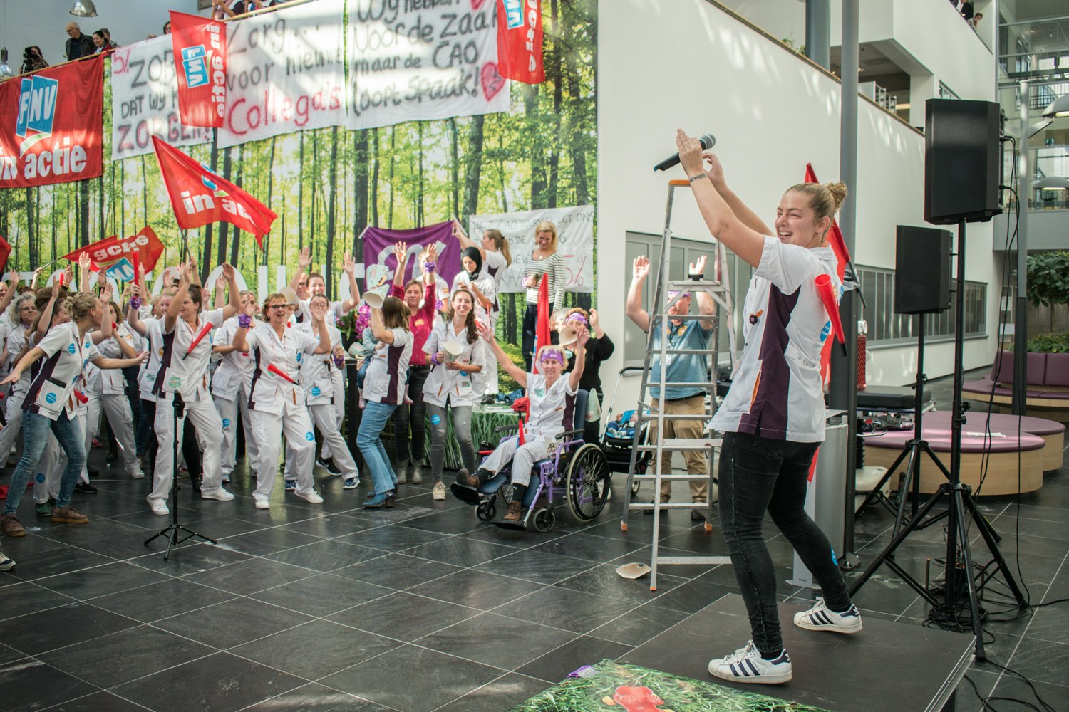 “Het feit dat er nog steeds geen goede cao ligt is echt een schande”, zegt Elise Merlijn, vakbondsbestuurder voor ziekenhuizen van het FNV. “Het wordt hoog tijd dat 200.000 ziekenhuismedewerkers een goede cao krijgen.”