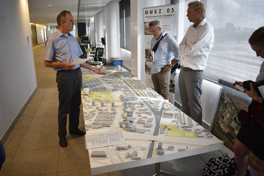 Voor we op de fiets stappen legt Paulus Jansen aan de hand van een maquette in het stadskantoor uit wat er allemaal gaat gebeuren in de Merwedekanaalzone. Het gebied van de punt van Oog in Al en de Westraven moet over een paar jaar zijn omgetoverd tot een nieuwe stadswijk van Utrecht. DUIC berichtte al eerder over de precieze plannen en maakte dit gedetailleerde overzicht.