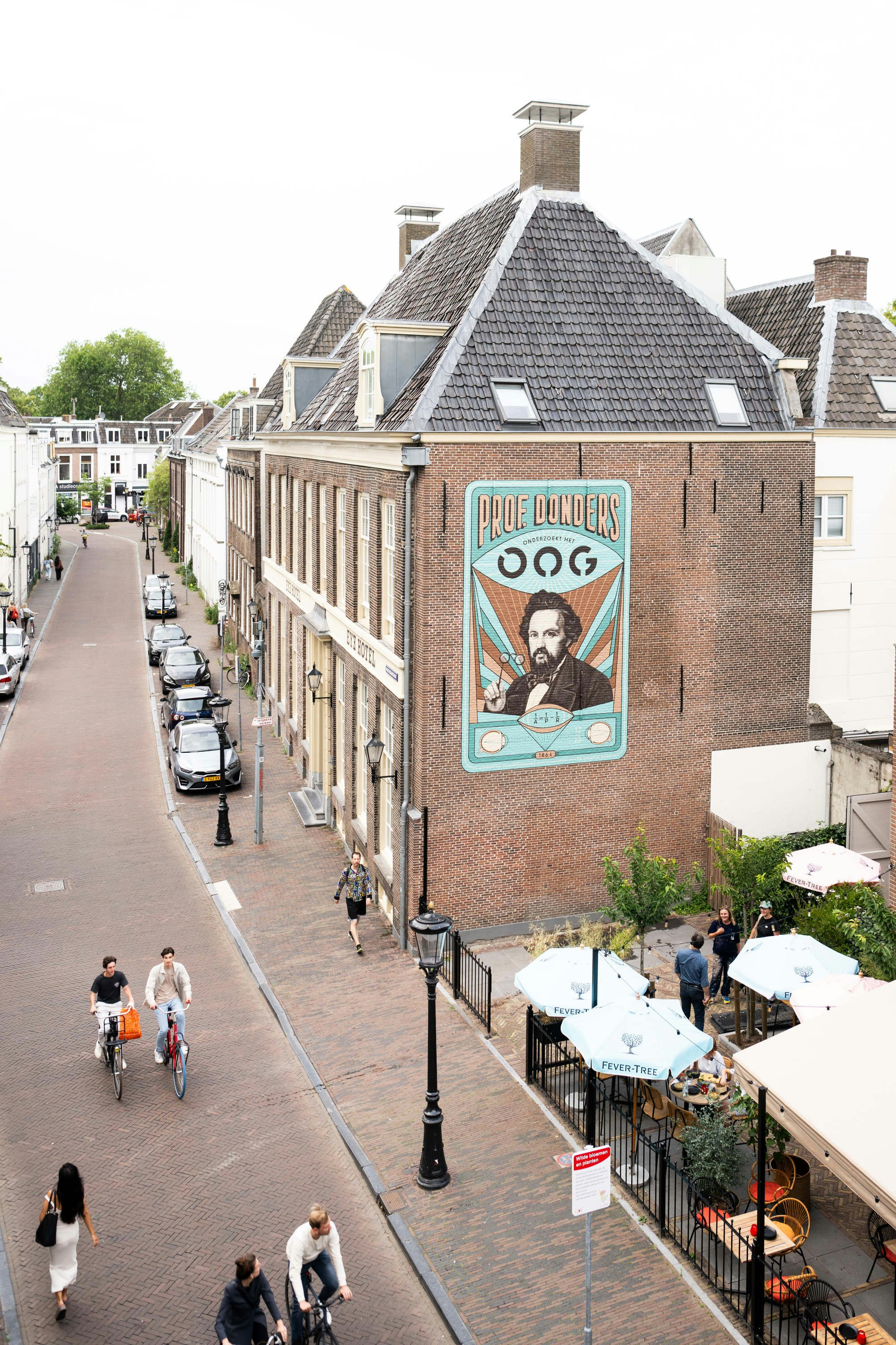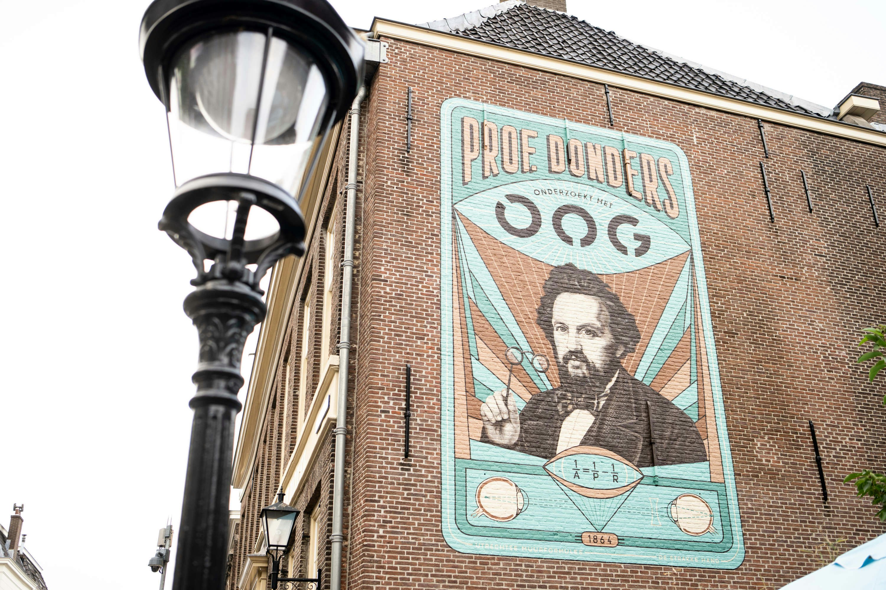 Je moet heel wat aan je ogen mankeren, wil je het nieuwste eerbetoon aan oogheelkundige Franciscus Cornelis Donders over het hoofd zien. Vanaf de zijmuur van zijn voormalige werkplek, aan de Wijde Begijnestraat in hartje Utrecht, kijkt de wetenschapper voorbijgangers met een kritisch onderzoekende blik aan. Het is het vijfde werk gemaakt door De Strakke Hand in de serie Utrechtse muurformules.
