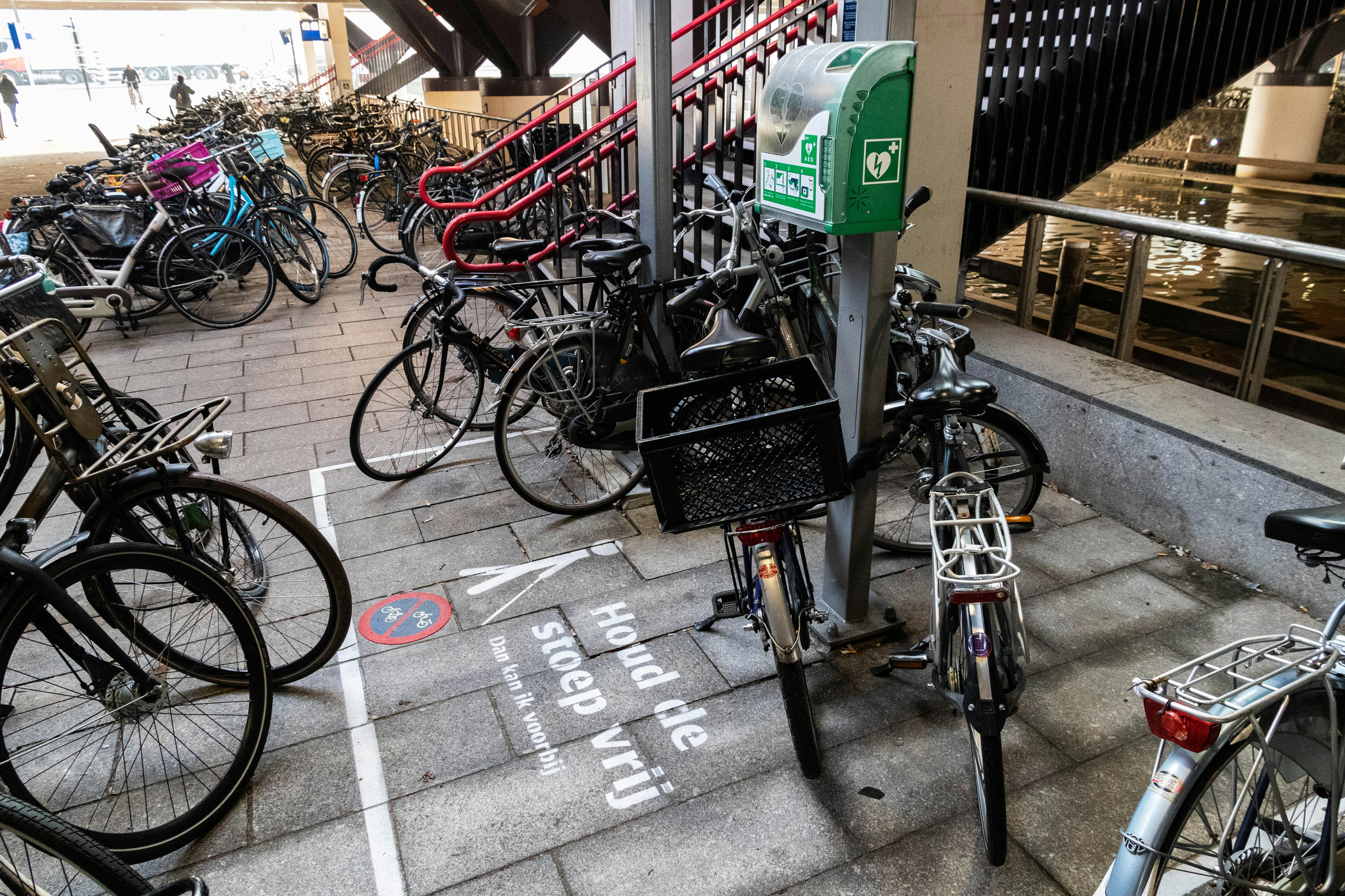 In het vierkant staat ook een paal met daarop een AED. Zo’n defibrillator kan gebruikt worden wanneer iemand een hartstilstand krijgt. Dit apparaat is door de geparkeerde fietsen ook minder toegankelijk.