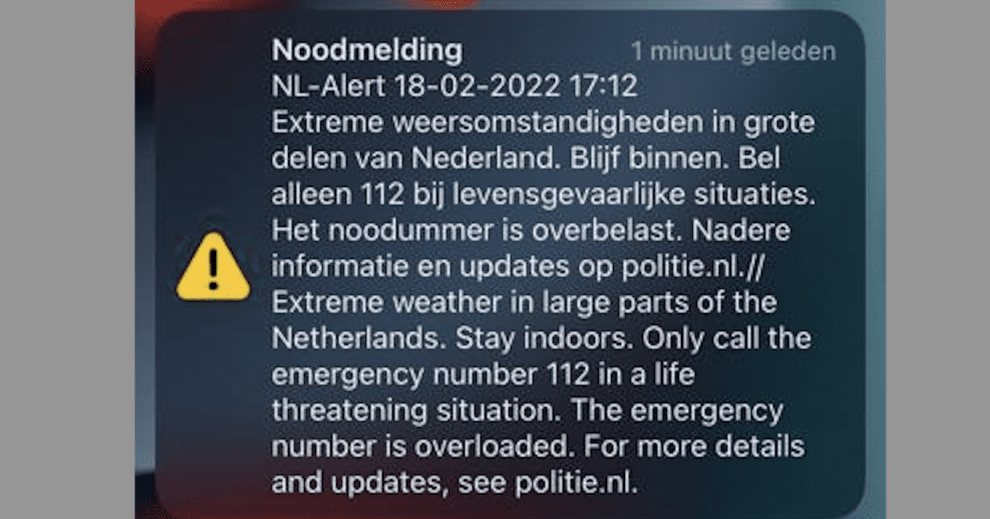 Inwoners van Utrecht hebben zojuist een NL Alert ontvangen vanwege de extreme weersomstandigheden. Het noodnummer 112 is overbelast, er wordt opgeroepen alleen te bellen in levensgevaarlijke situaties.